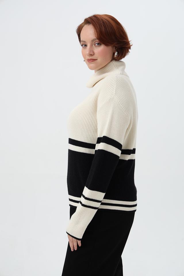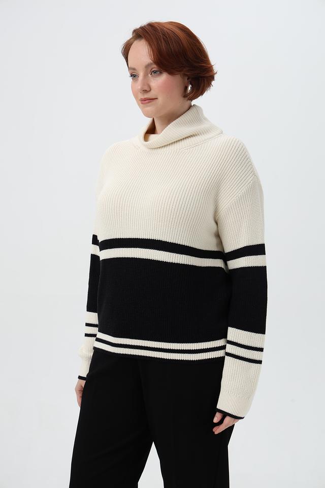 Пуловер имеет высокий воротник и длинные рукава, а также свободный крой, который обеспечивает комфорт и свободу движений.