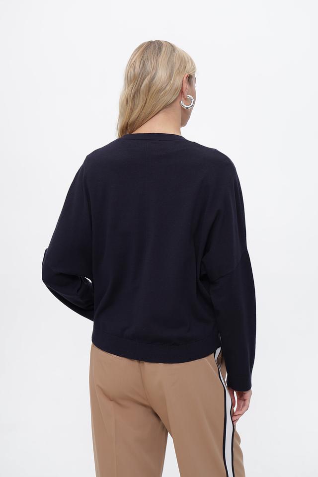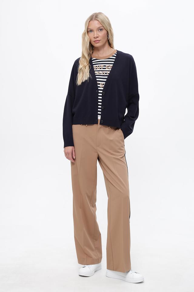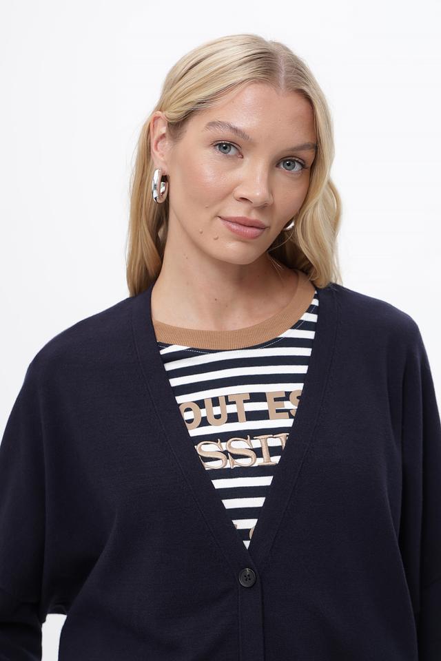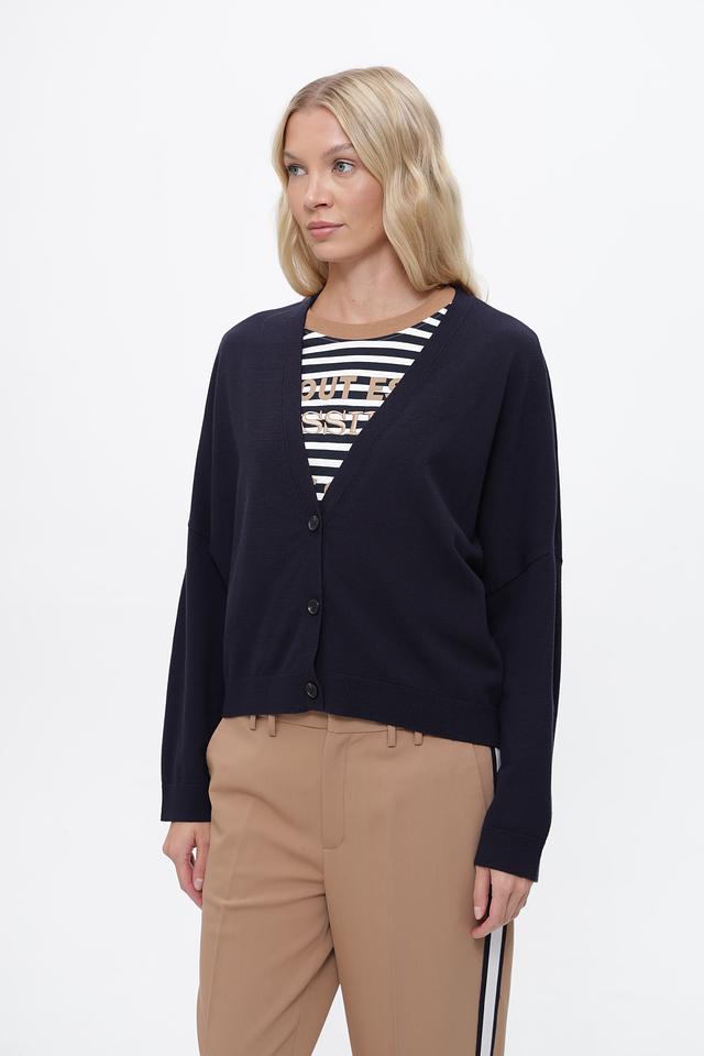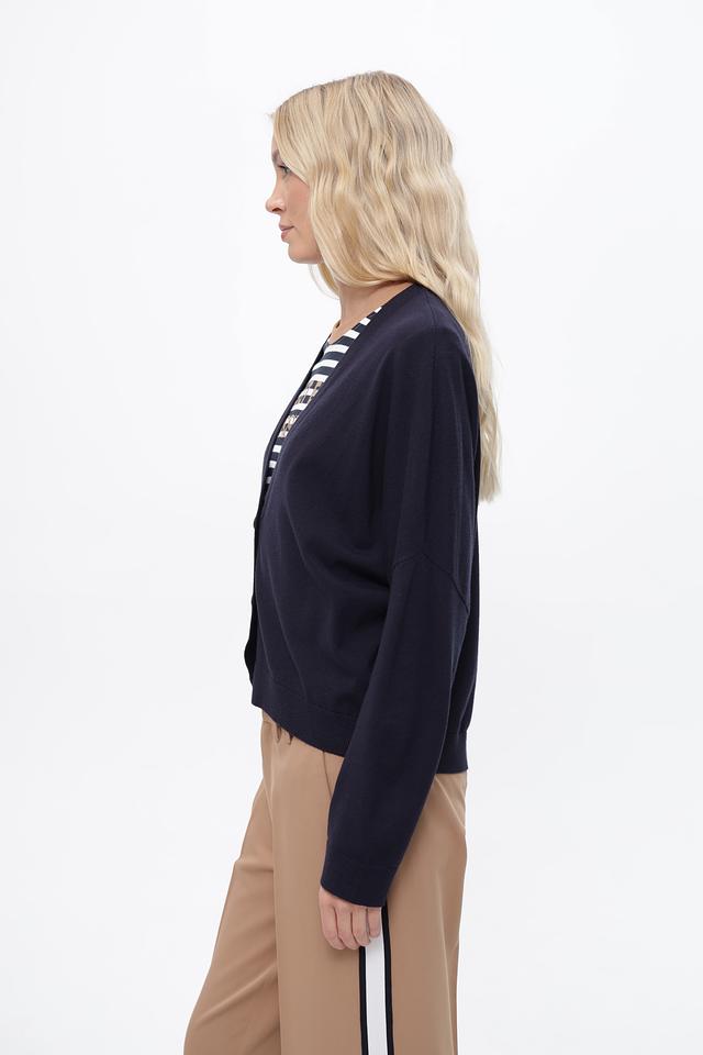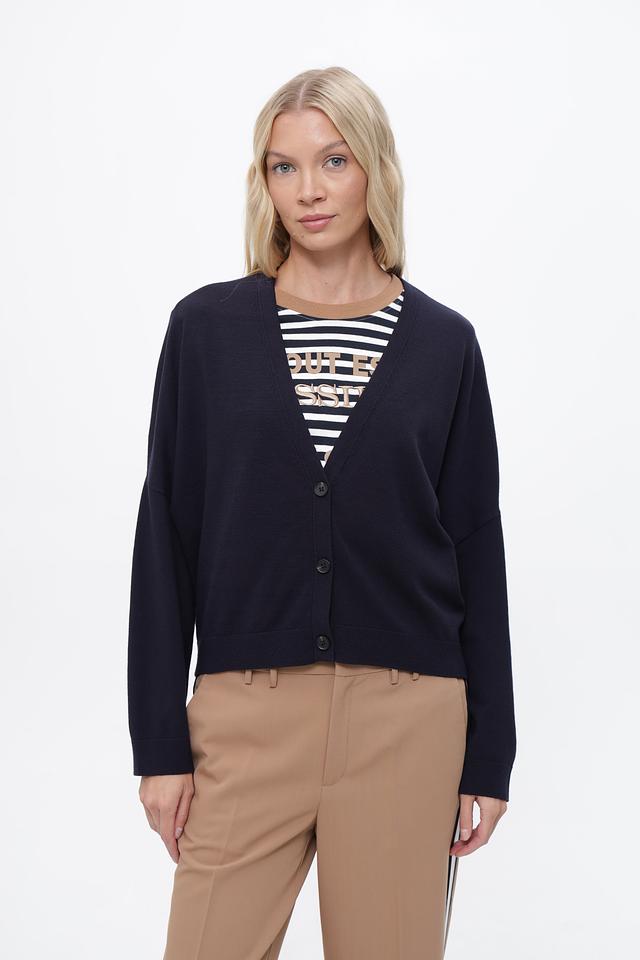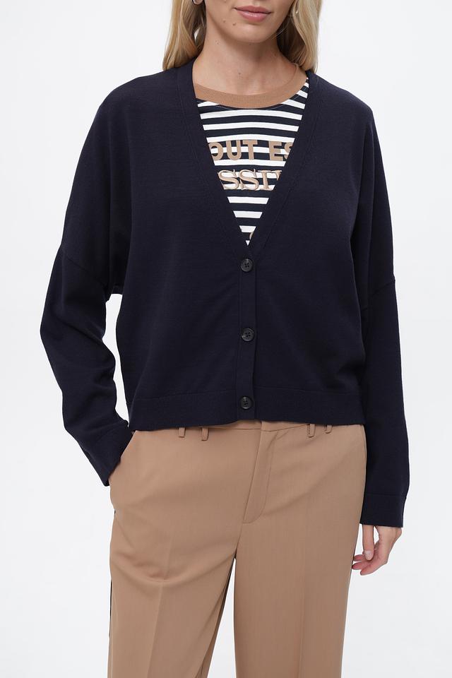 Женский жакет Miss Lagotte темно-синего цвета, выполнен из мягкого трикотажа. Классический V-образный вырез, застежка на пуговицы и свободный крой. Состав: вискоза, полиэстер, полиамид. Состав: вискоза 52%, полиэстер 30%, полиамид 18%