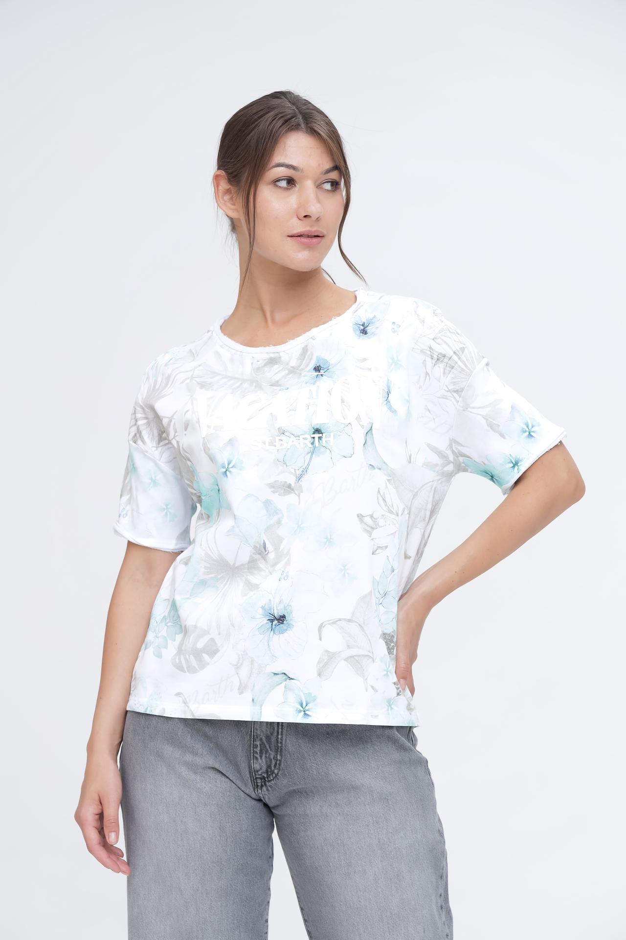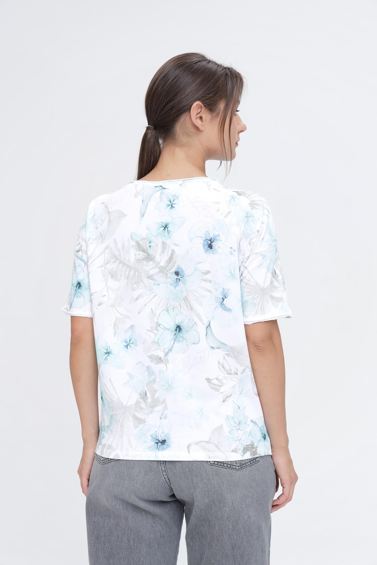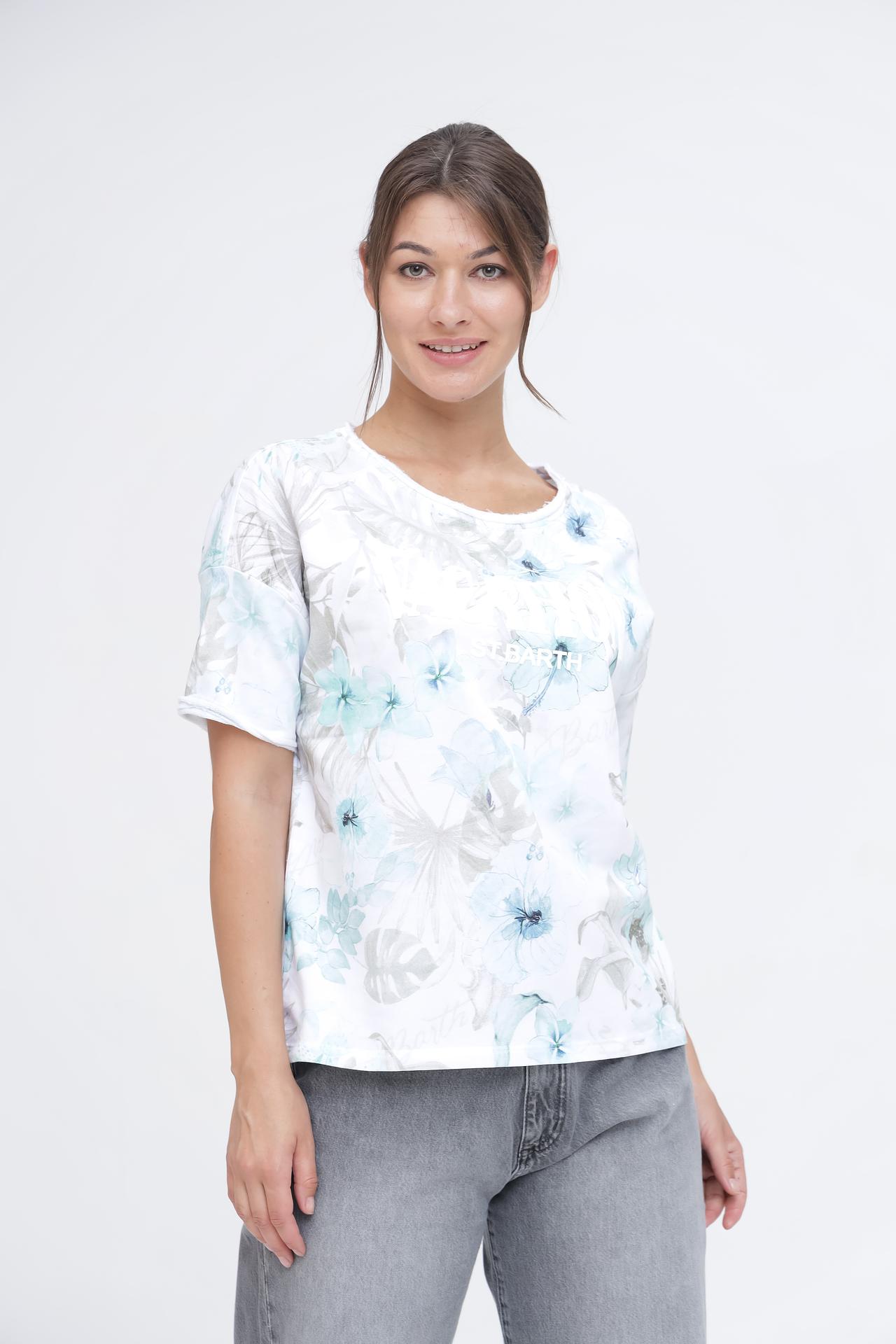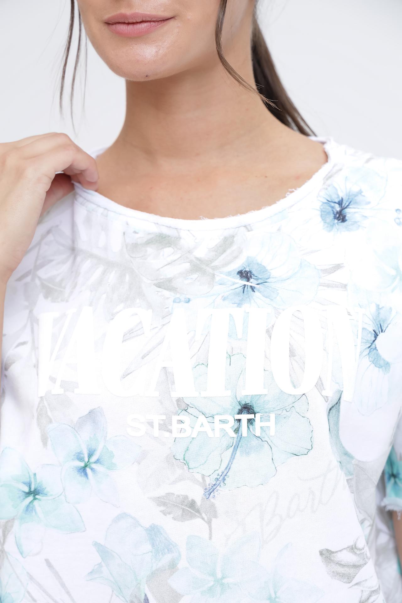 Пуловер Monari из 100% хлопка – идеальное решение для стильного и комфортного летнего образа. Изготовлен из высококачественного натурального материала, он обеспечивает максимальную воздухопроницаемость и приятные тактильные ощущения в течение всего дня. Элегантный белый фон украшен изысканным цветочным принтом в нежных голубых и серых тонах, создавая легкое и свежее настроение. Оригинальная надпись "VACATION ST. BARTH" на груди добавляет изделию индивидуальности и модный акцент, подчеркивая вашу любовь к путешествиям и беззаботному стилю.