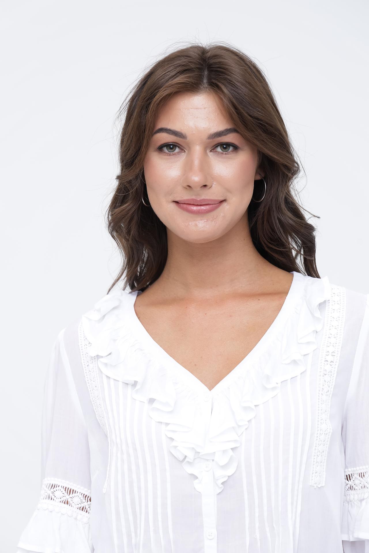 - Элегантный дизайн: V-образный вырез горловины украшен объемными рюшами, придающими образу романтичность и утонченность. Вертикальные защипы на передней части блузки создают эффектный рельеф и визуально вытягивают силуэт.
