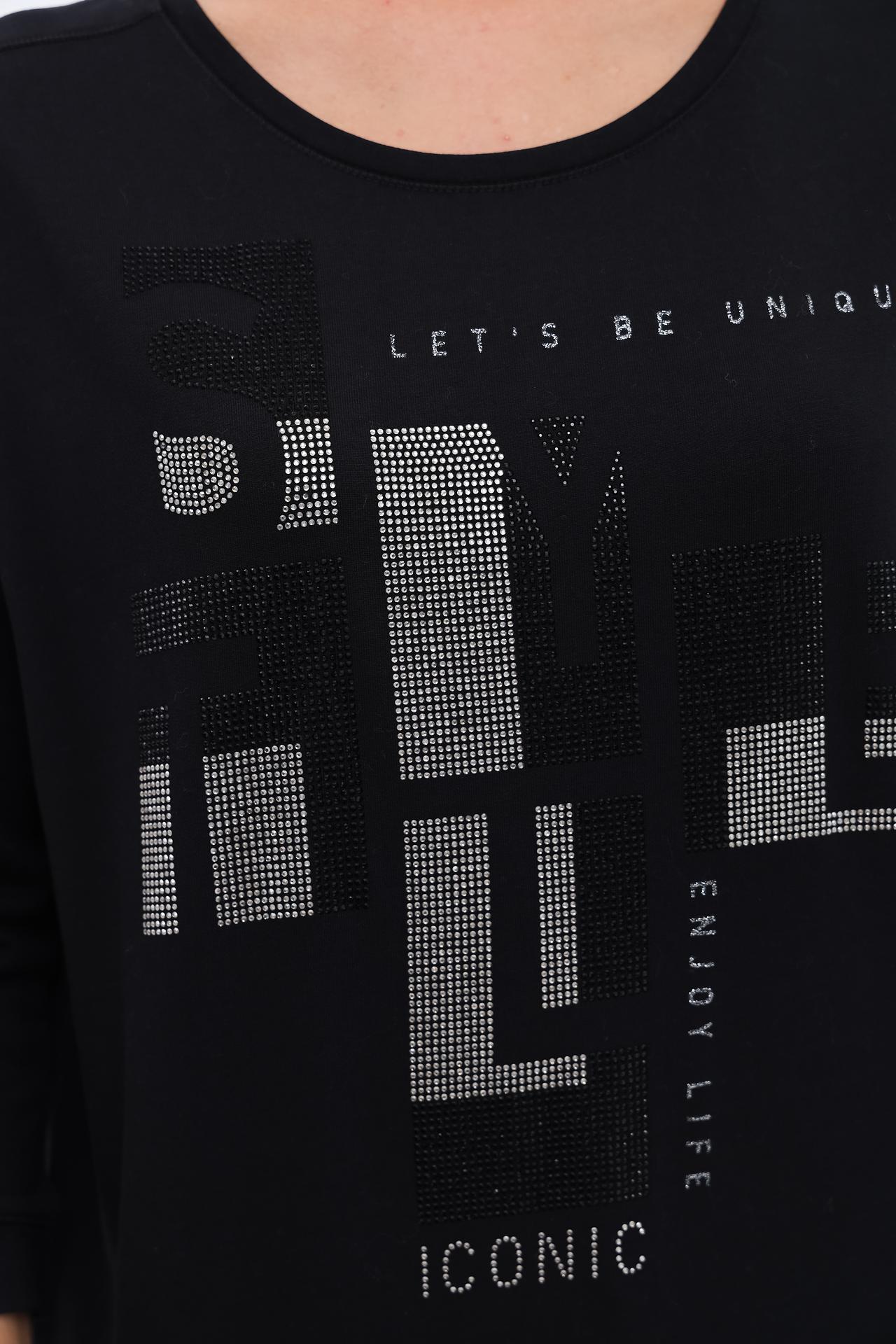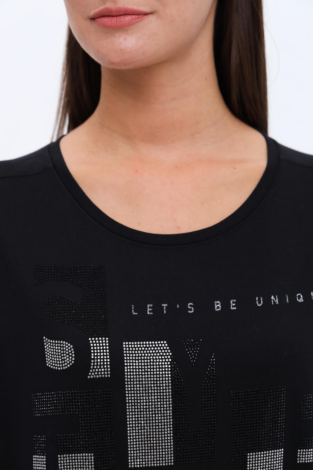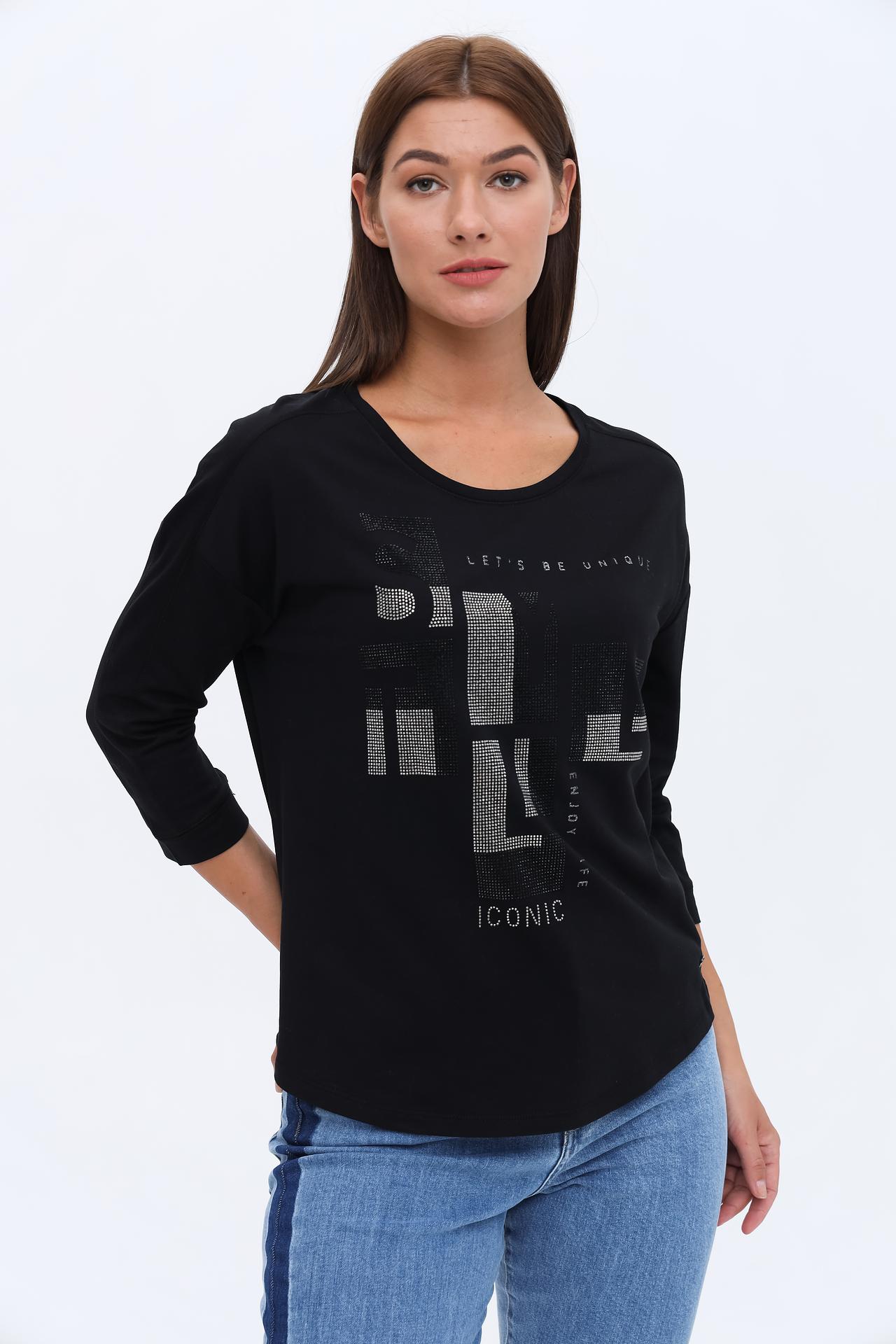 - Дизайн: Классический крой лонгслива с рукавом 3/4. Оригинальный принт из стразов на груди, состоящий из геометрических фигур и надписей "LET'S BE UNIQUE", "ENJOY LIFE", "ICONIC", придает изделию модный акцент.