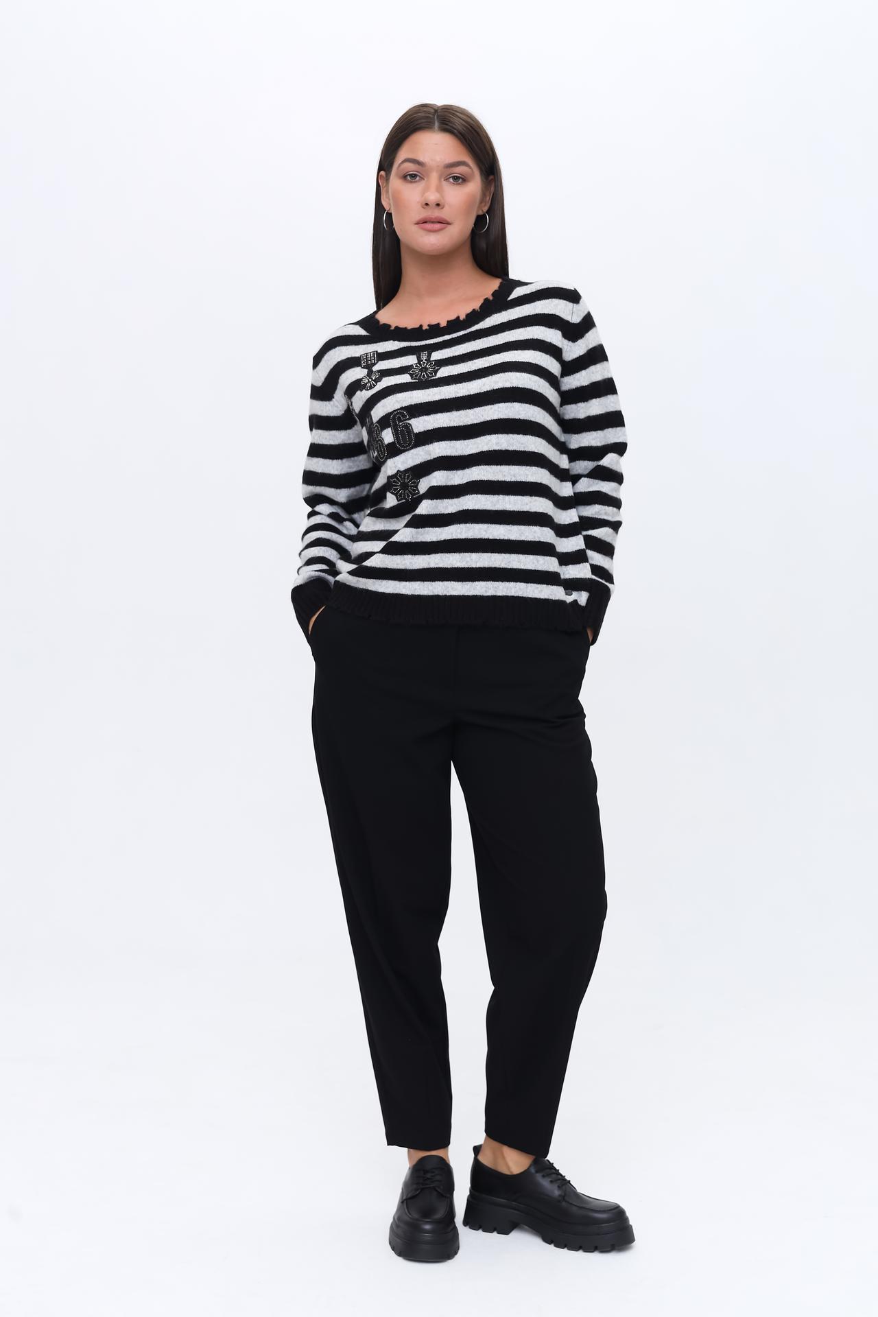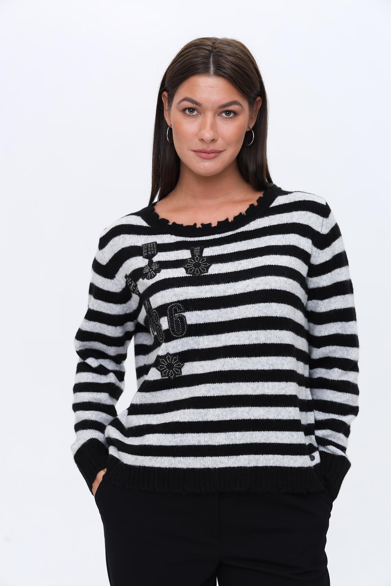 Элегантный пуловер от Monari в классическую черно-белую полоску станет стильным дополнением вашего гардероба. Оригинальный дизайн дополнен декоративными элементами в виде вышивки и стразов, имитирующих ордена и цифры, что придает изделию неповторимый шарм. Такой пуловер легко впишется как в повседневный, так и в более нарядный образ.
