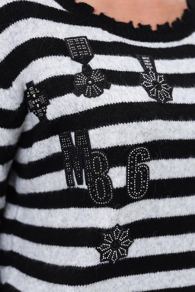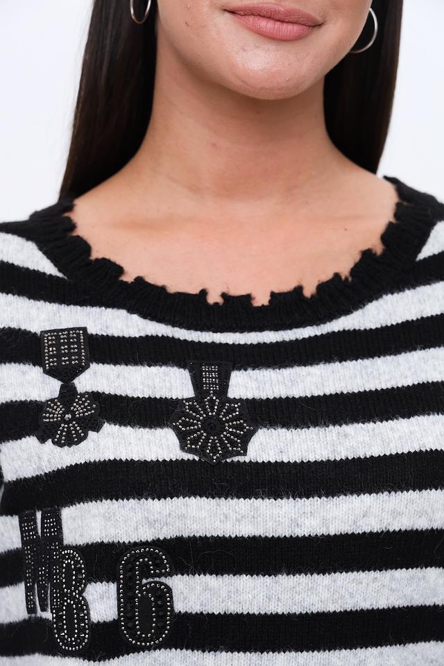 Женский пуловер Monari чёрно-белого цвета с полосатым узором и декоративной отделкой в виде цифр и цветочных элементов. Модель выполнена из мягкого трикотажа с добавлением шерсти для комфорта и тепла. Состав: полиакрил 55%, полиамид 40%, шерсть 5%