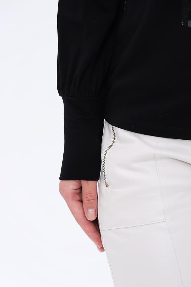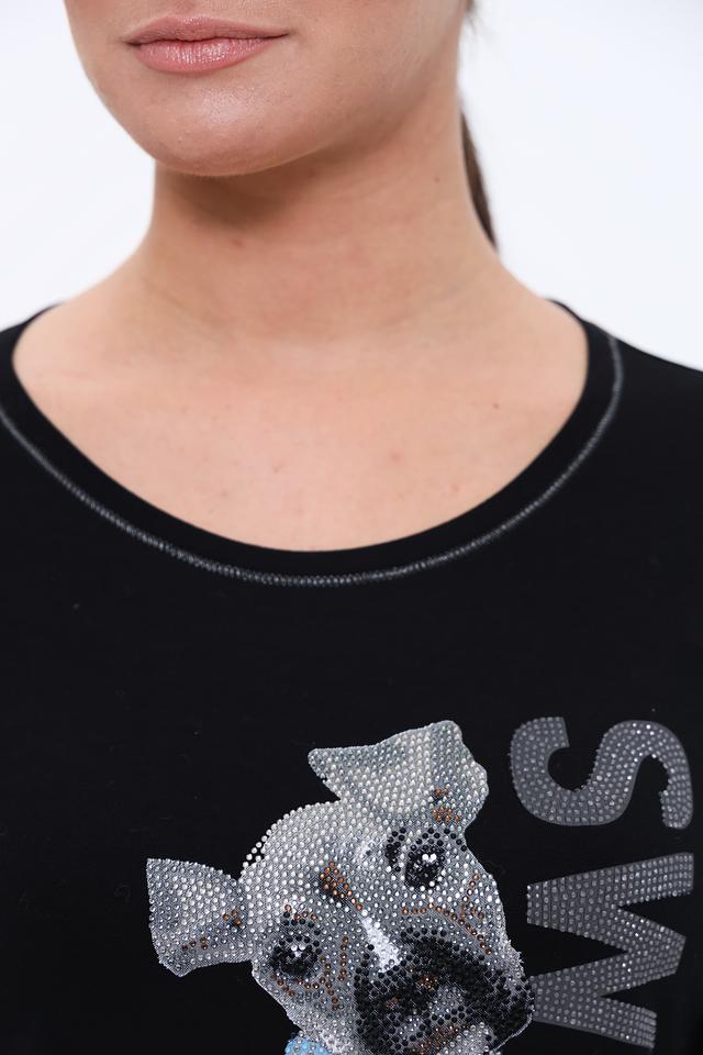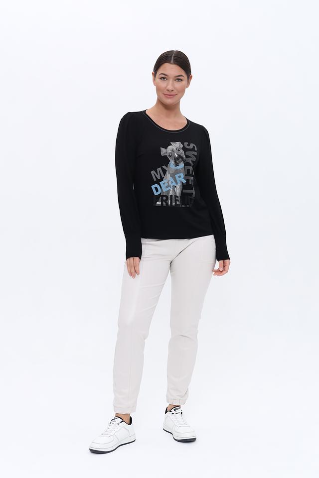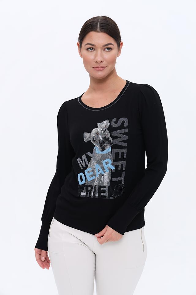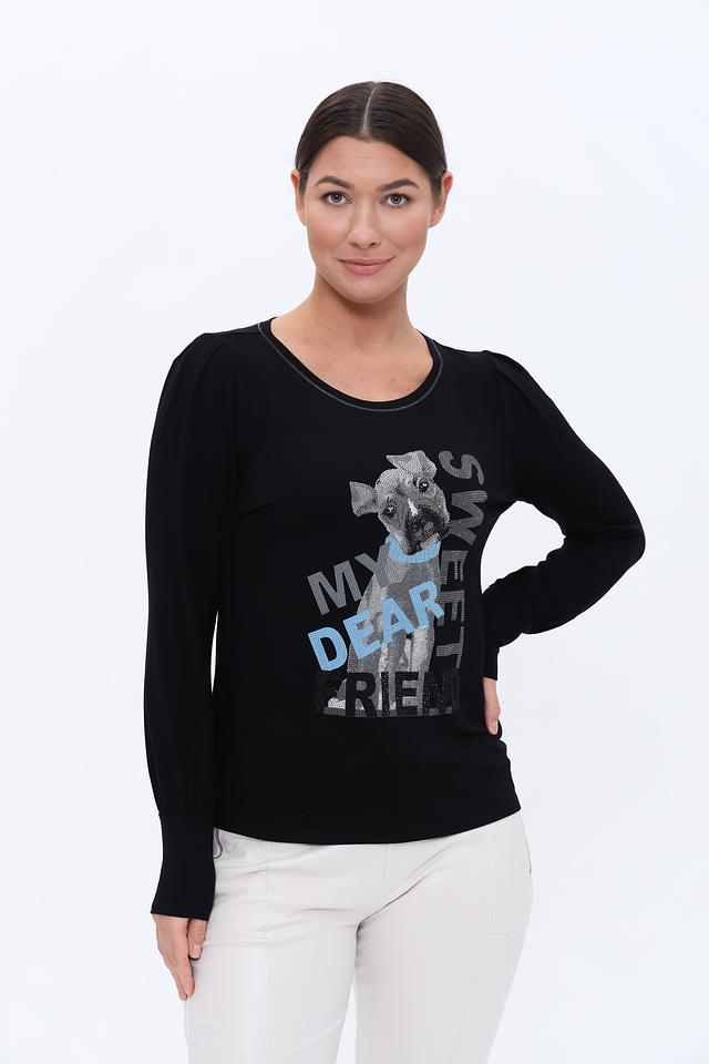 Чёрный лонгслив Monari с ярким принтом собаки – стильная и комфортная модель на каждый день. Изготовлен из мягкого и приятного к телу трикотажа, обеспечивающего свободу движений. Состав: модал 45%, вискоза 45%, эластан 10%