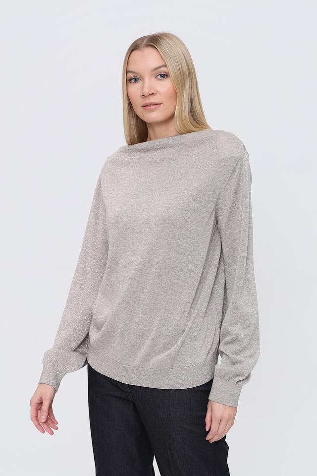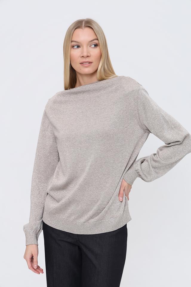 Этот стильный пуловер от Monari выполнен в нежном бежевом цвете и отличается деликатным блеском, который придаёт ему особый шарм. Модель имеет свободный крой и рукава-фонарики, создающие лёгкий и женственный силуэт.