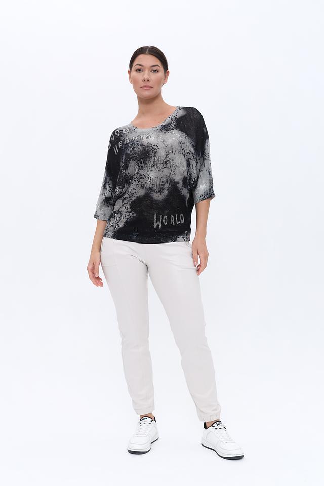 Женский пуловер Monari чёрно-белого цвета с оригинальным принтом и надписями. Модель свободного кроя с рукавами 3/4 выполнена из мягкого хлопкового трикотажа, что обеспечивает комфорт в носке. Состав: хлопок 85%, полиэстер 15%