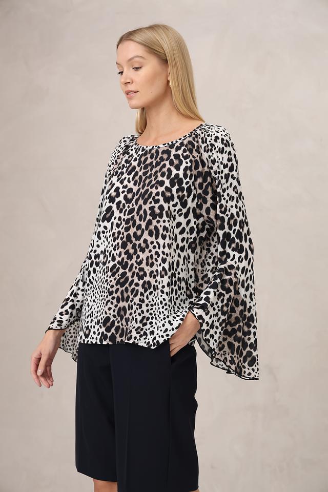 Основной цвет блузы – белый, но ее главным украшением является яркий леопардовый принт, который придает ей индивидуальность и выразительность. Рукава блузы – колокол, что добавляет образу романтичности и легкости.