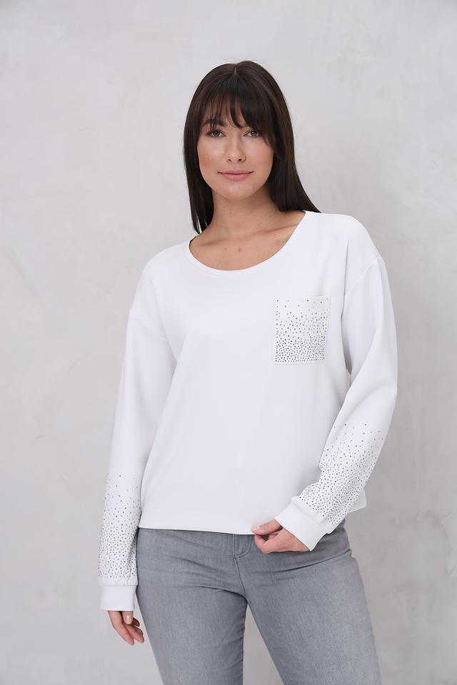 Белый пуловер Monari с декором из кристаллов – стильное и комфортное решение для повседневного образа. Модель имеет свободный крой и круглый вырез горловины, а также украшена сверкающими элементами на рукавах и нагрудном кармане. Состав: полиэстер 55%, вискоза 38%, эластан 7%