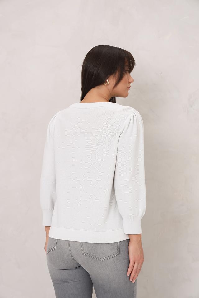 Модель имеет свободный крой и слегка спущенную линию плеч, что обеспечивает комфортную посадку. Рукава ¾ с небольшим буфом придают образу женственность и лёгкость. Пуловер изготовлен из высококачественного 100% хлопка, что делает его приятным к телу и обеспечивает отличную воздухопроницаемость.