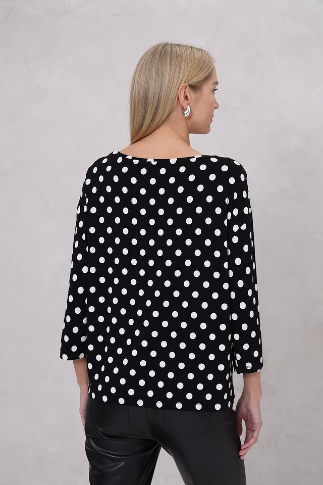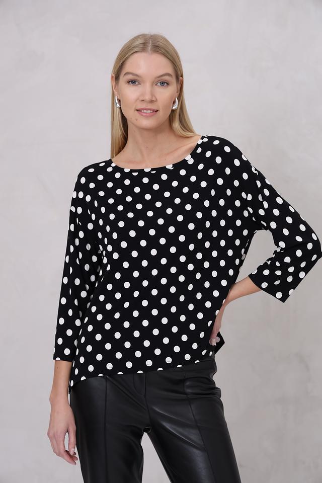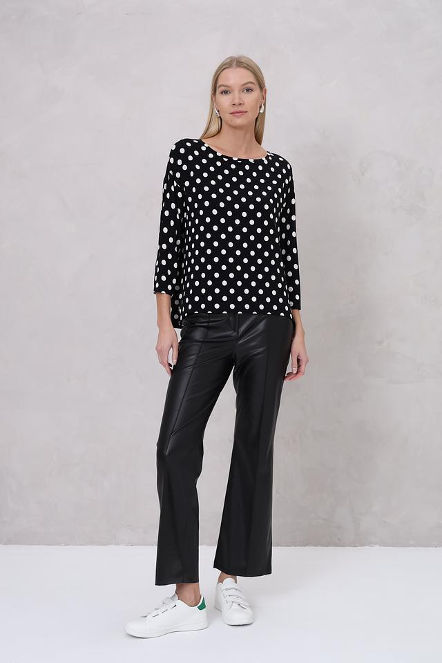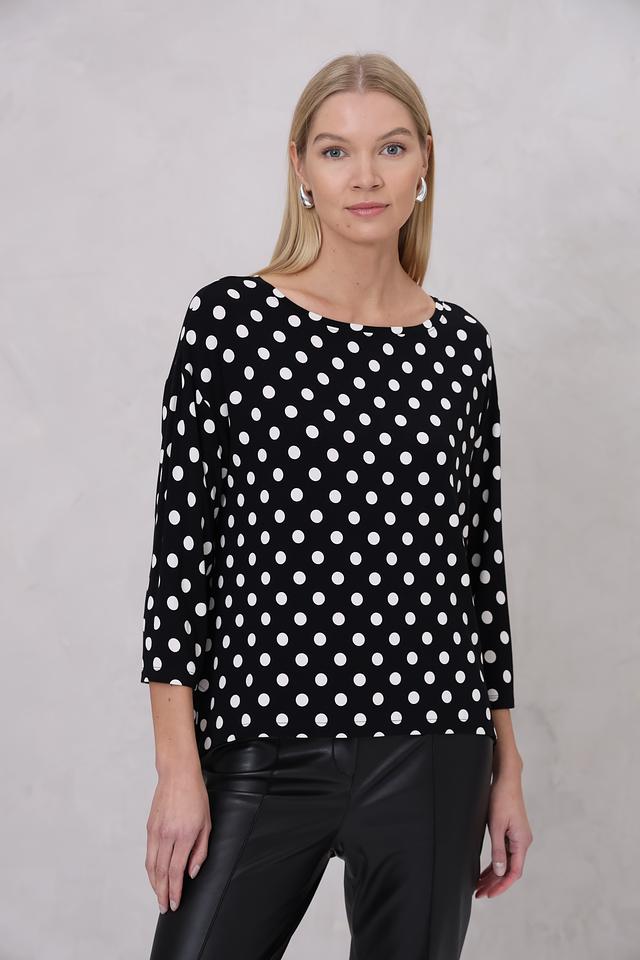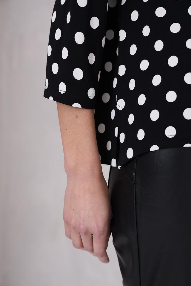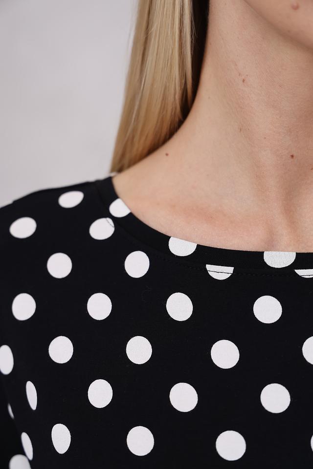Лонгслив имеет классический крой с длинными рукавами и округлым вырезом горловины. Его украшает очаровательный принт в виде белого горошка на чёрном фоне, который придаёт образу игривость и женственность.