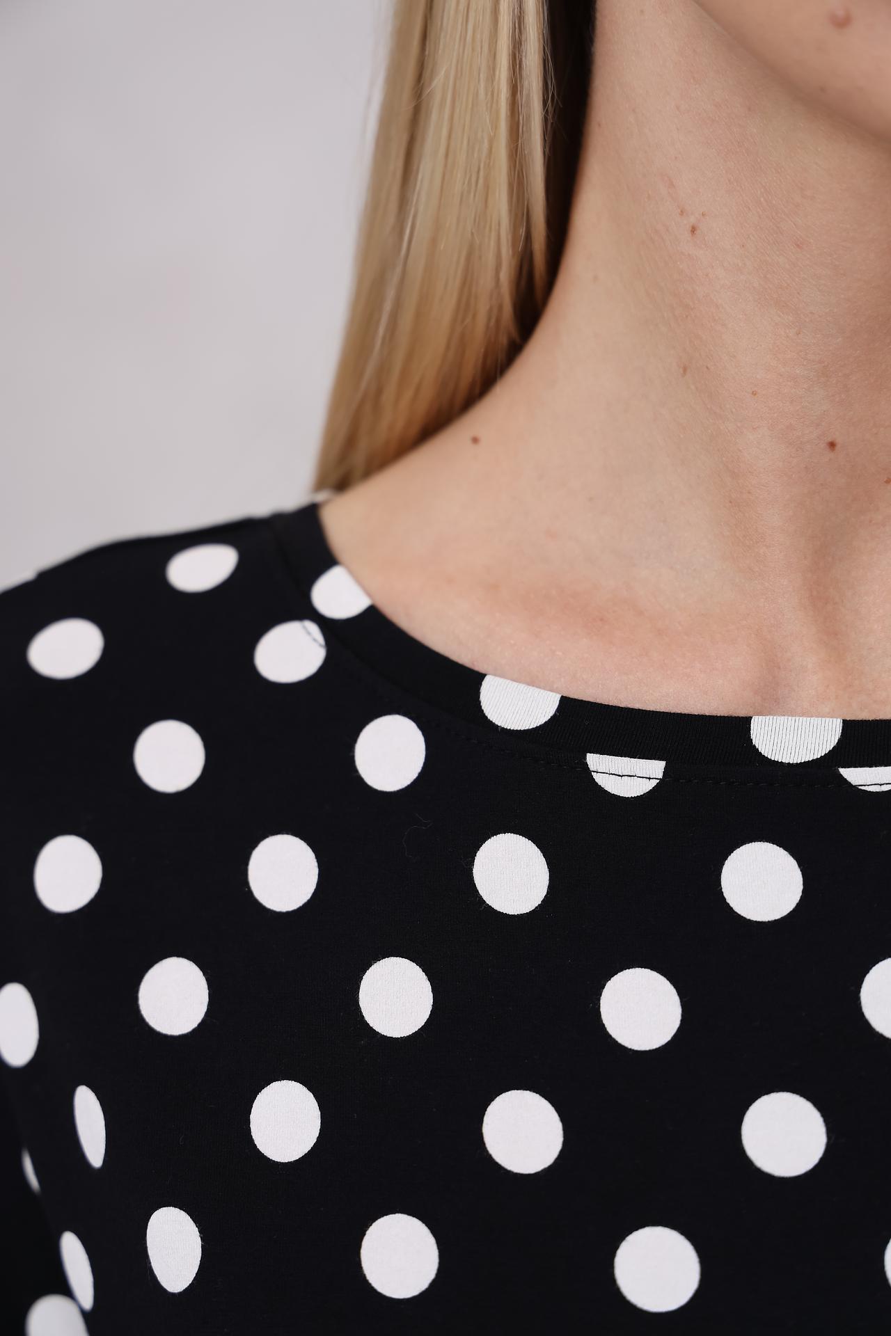 - Дизайн: Классический черный фон украшен контрастным белым горошком, что придает лонгсливу игривый и стильный вид. Этот узор никогда не выходит из моды.