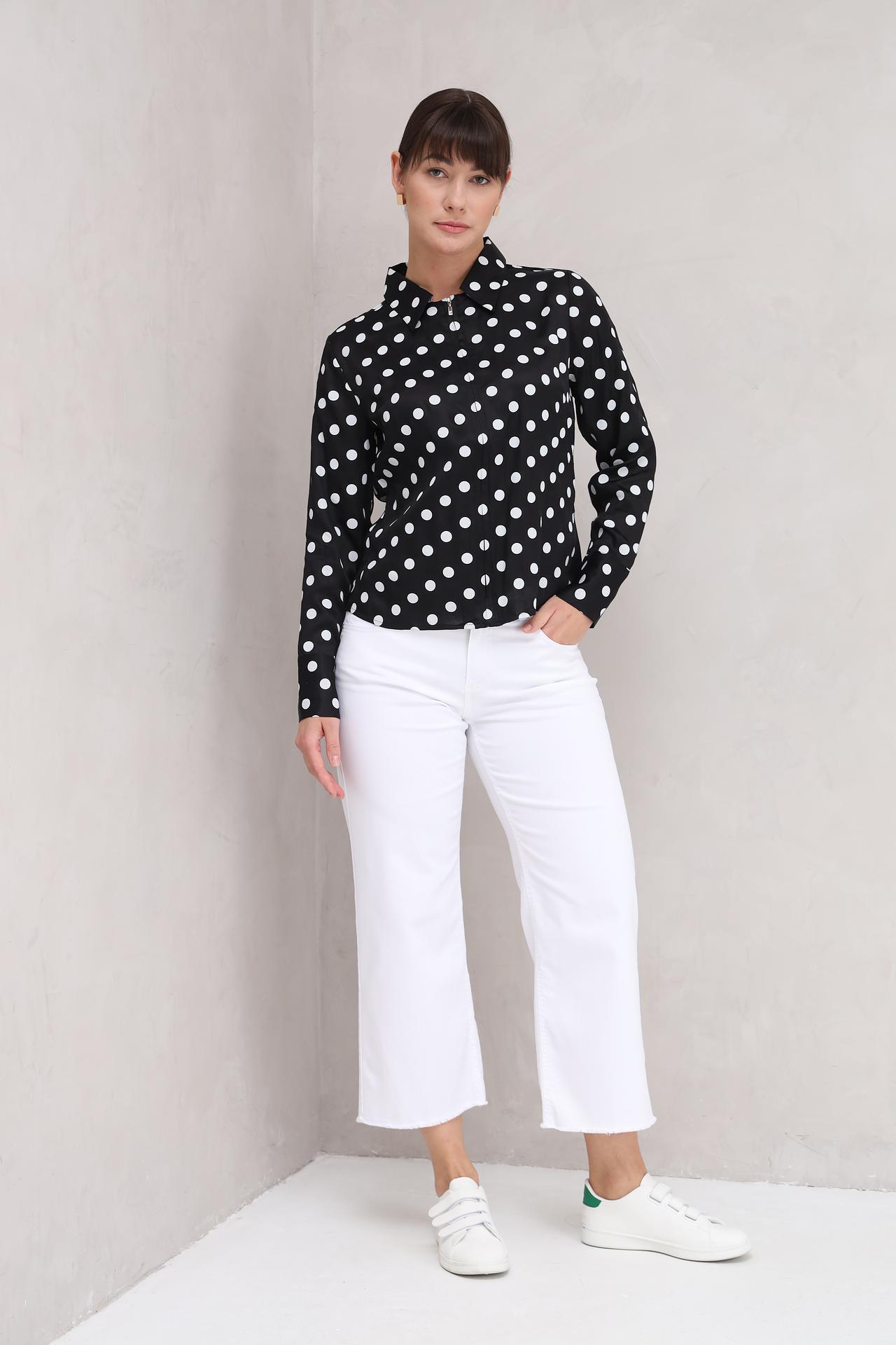 - Дизайн: Классический черный цвет, украшенный белым принтом в горошек, создает игривый и одновременно элегантный образ. Фронтальная молния добавляет современный акцент и обеспечивает удобство.