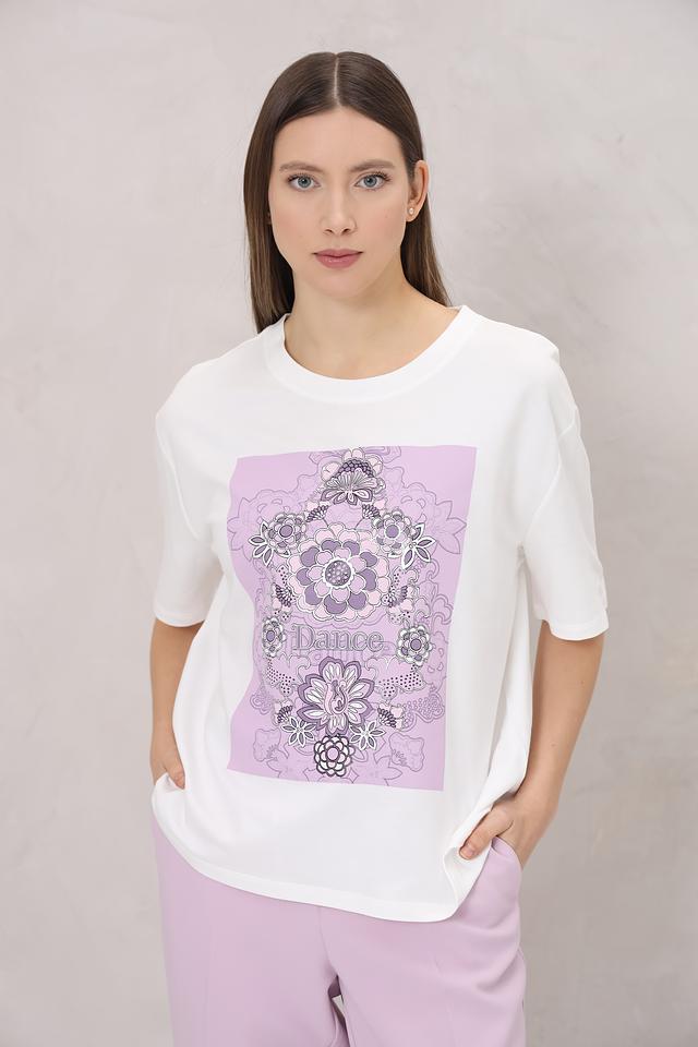 Белая футболка Monari с ярким цветочным принтом в лиловых тонах станет стильным дополнением к вашему гардеробу. Модель свободного кроя из мягкого хлопка и модала обеспечит комфорт в течение дня. Состав: хлопок 50%, модал 50%