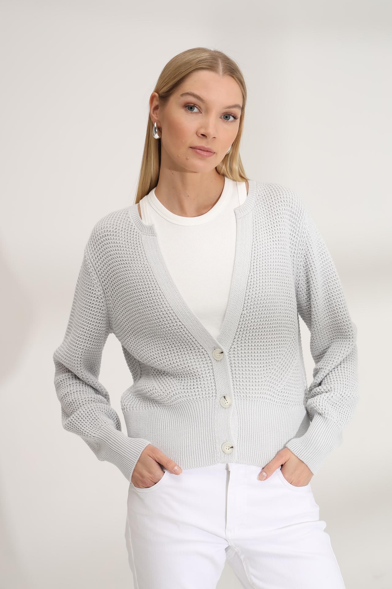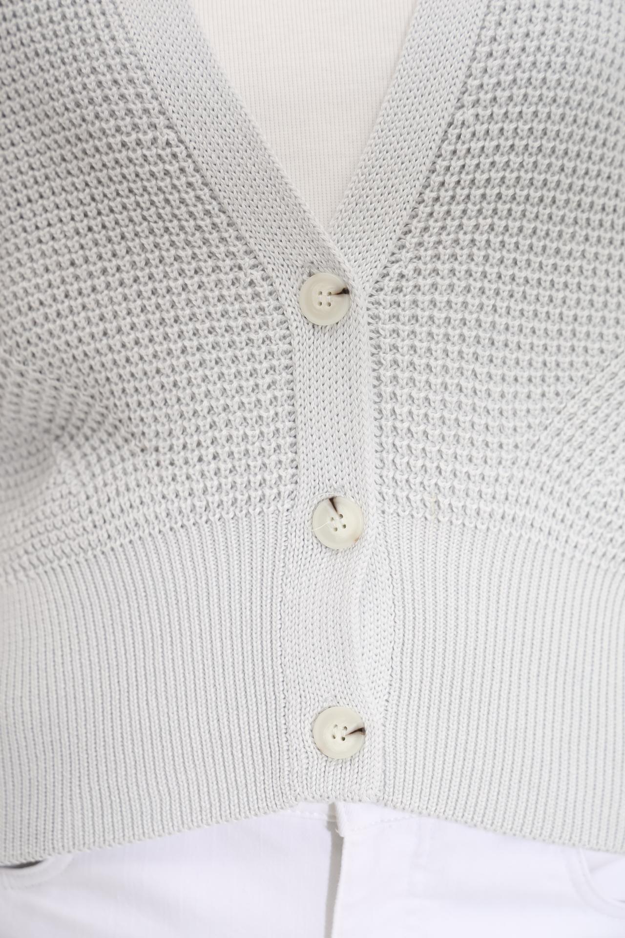 - Дизайн: Классический V-образный вырез и пуговицы по центру создают утонченный силуэт. Оригинальная вязка добавляет изделию изысканности.