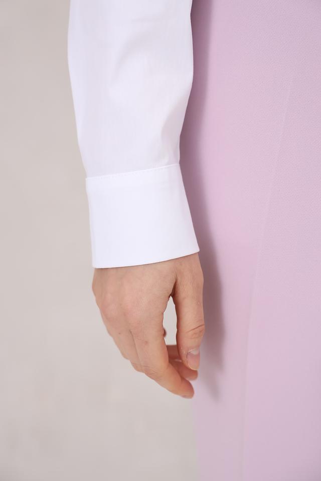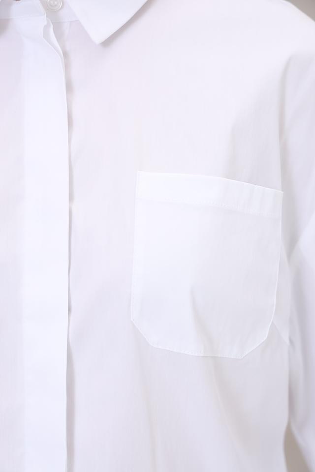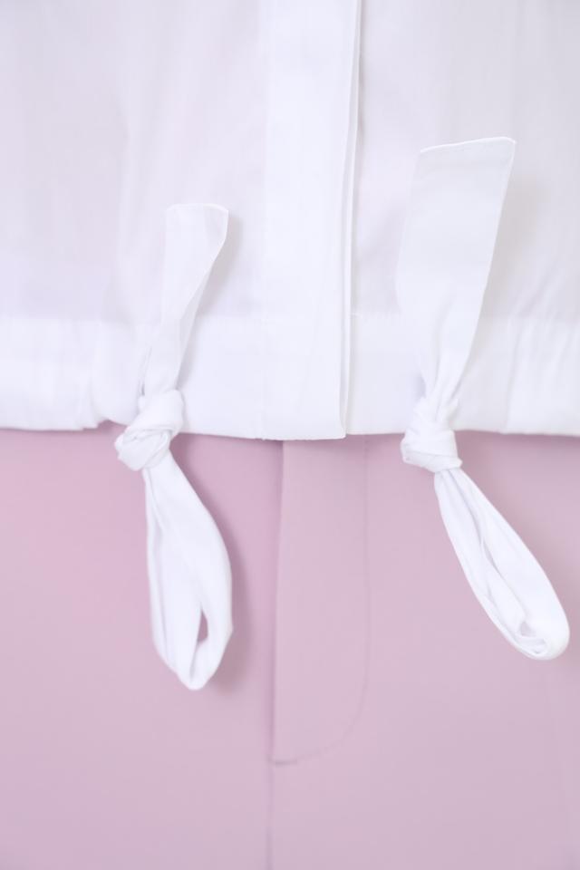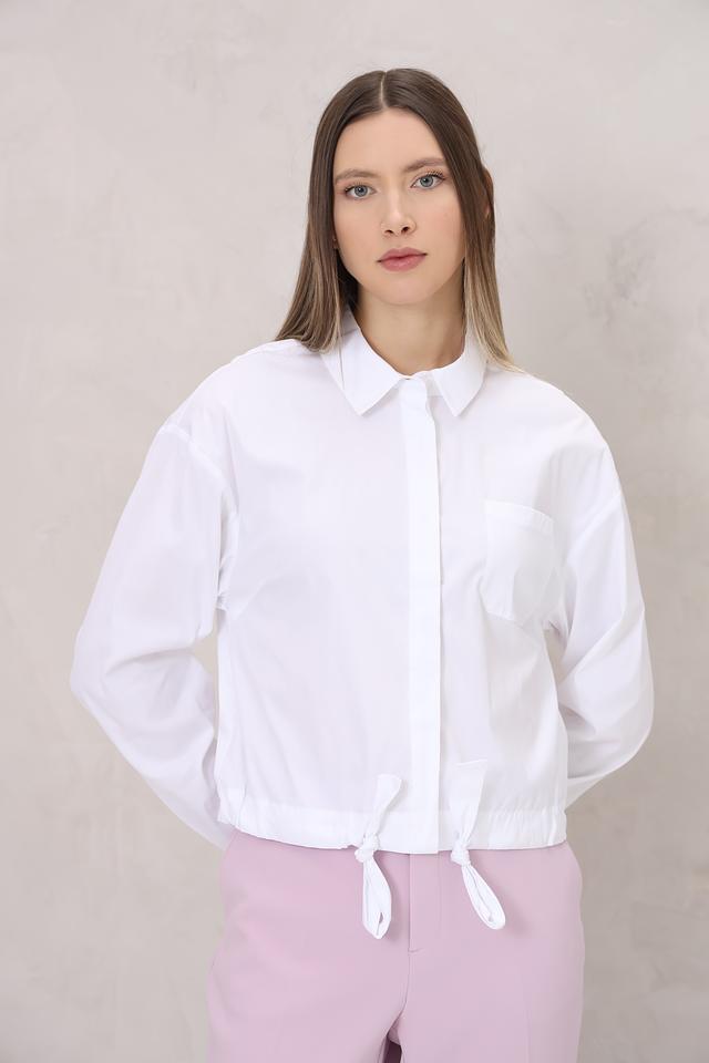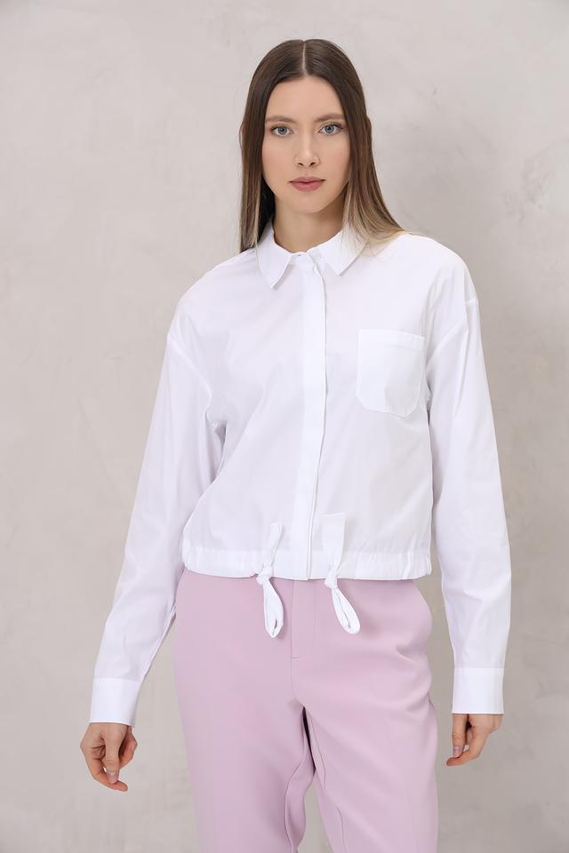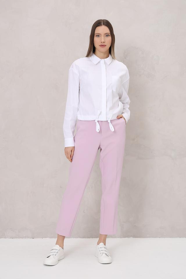 Блуза имеет прямой крой, длинные рукава и воротник-стойку. Особый акцент сделан на завязках по низу изделия, которые позволяют регулировать силуэт и создавать более женственный вид. Модель застегивается на пуговицы.