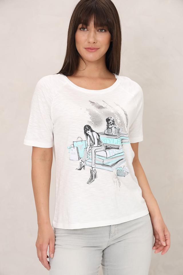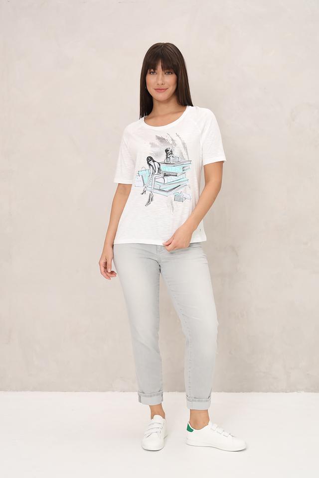 Белая футболка Monari с оригинальным принтом в виде стилизованного изображения девушки и архитектурных элементов. Изготовлена из мягкого хлопка с модалом, обеспечивающего комфорт и приятные ощущения при носке. Состав: хлопок 50%, модал 50%