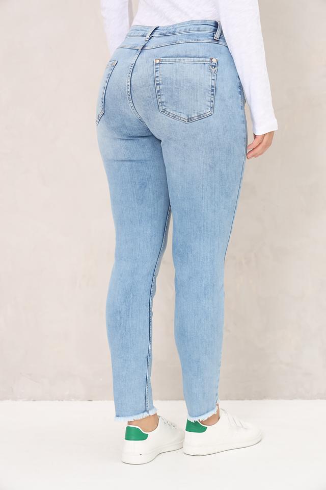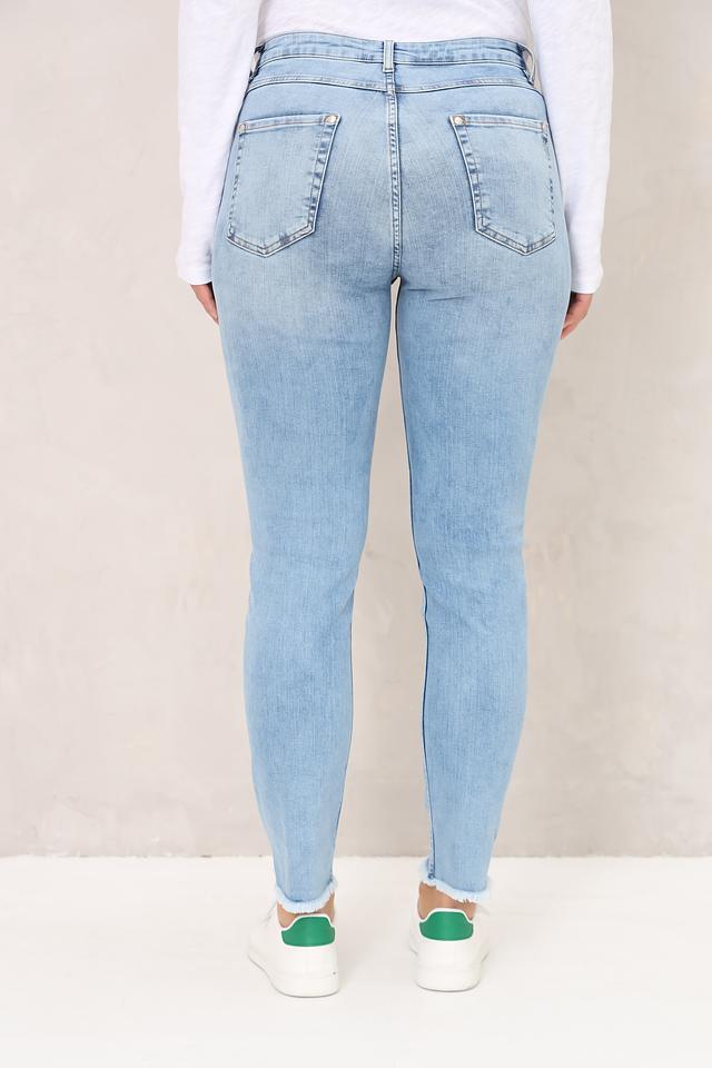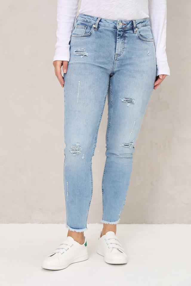 Женские джинсы Monari голубого цвета с эффектом потертостей и необработанным краем. Модель выполнена из хлопка с добавлением полиэстера и эластана для комфорта и лучшей посадки. Состав: хлопок 90%, полиэстер 7%, эластан 3%