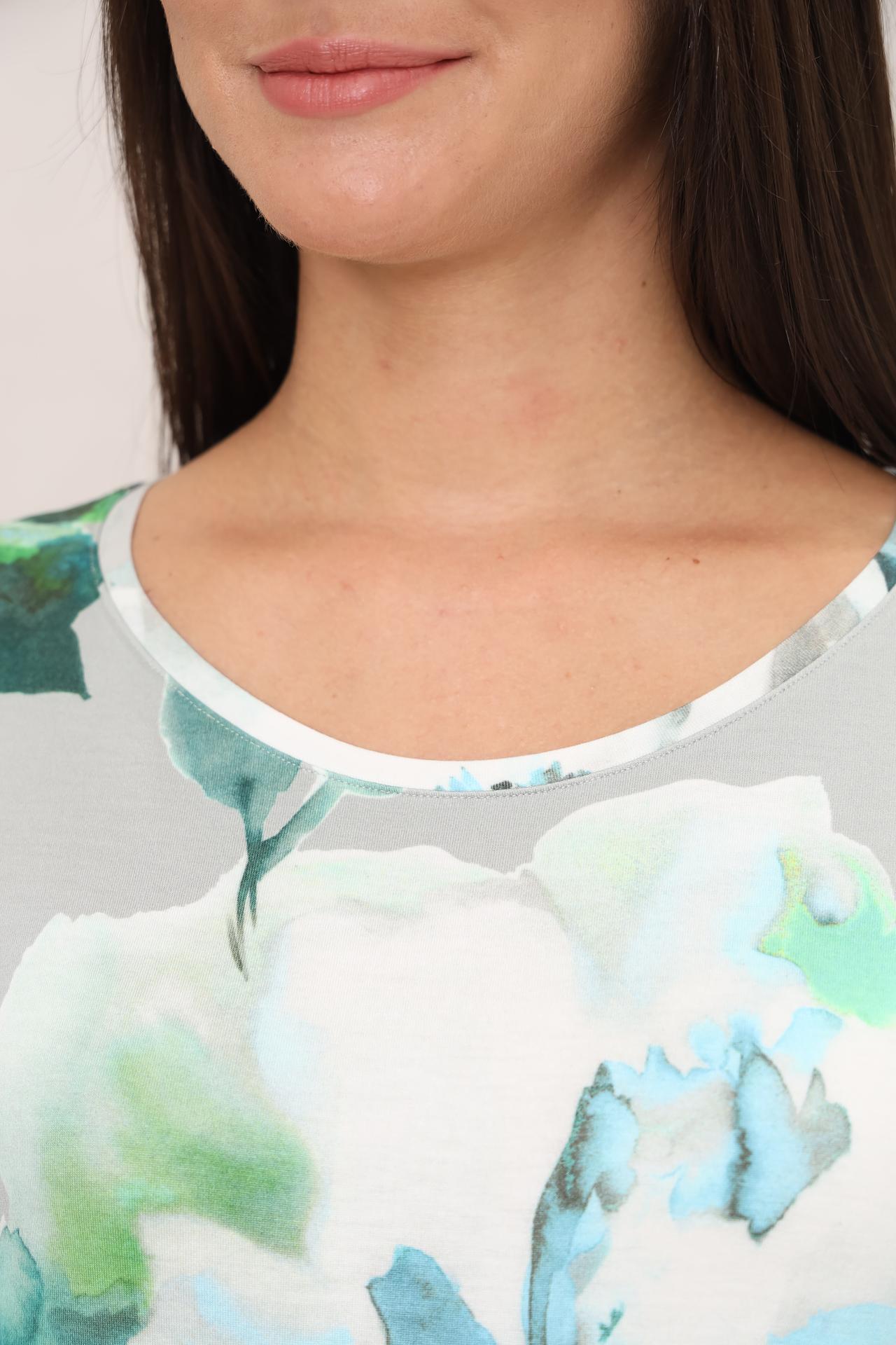 - Дизайн: Яркий цветочный принт в серо-голубых и зеленых тонах на светло-сером фоне. Вырез-лодочка и короткие рукава-кимоно придают модели утонченность.