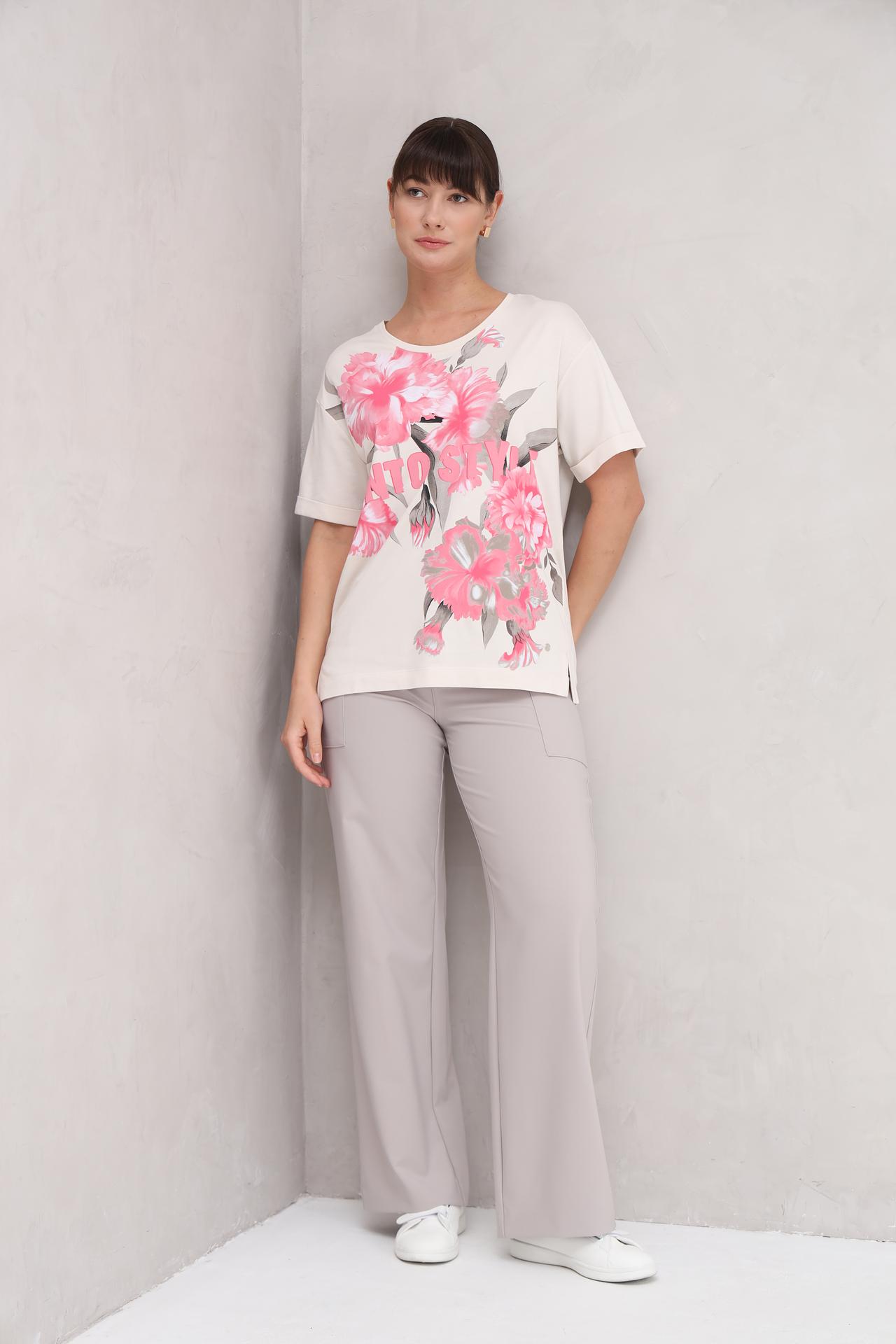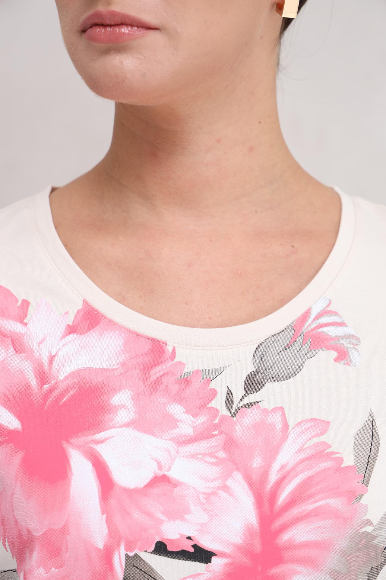 Модный дизайн с нежным цветочным принтом и текстом подчеркивает женственность и индивидуальность. Боковые разрезы добавляют модели изысканности и свободы движений. Прямой крой обеспечивает комфортную посадку.
