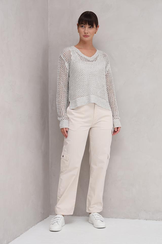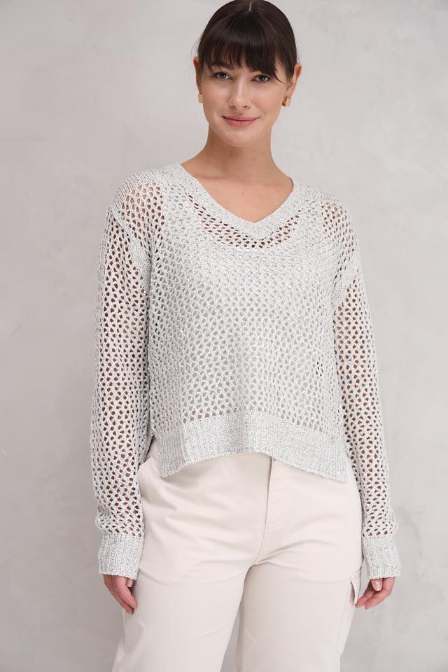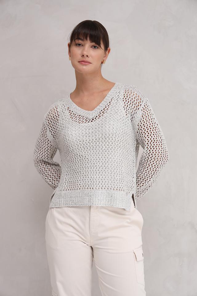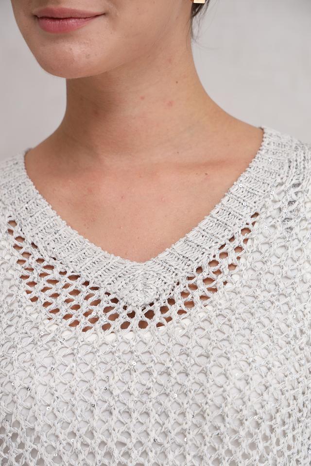 Пуловер имеет V-образный вырез и длинные рукава, что делает его универсальным для различных погодных условий. Ажурный трикотаж придает изделию воздушность и изысканность, а слегка укороченный силуэт подчеркивает талию.