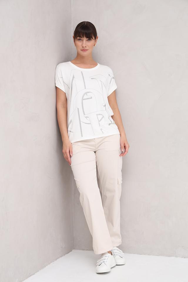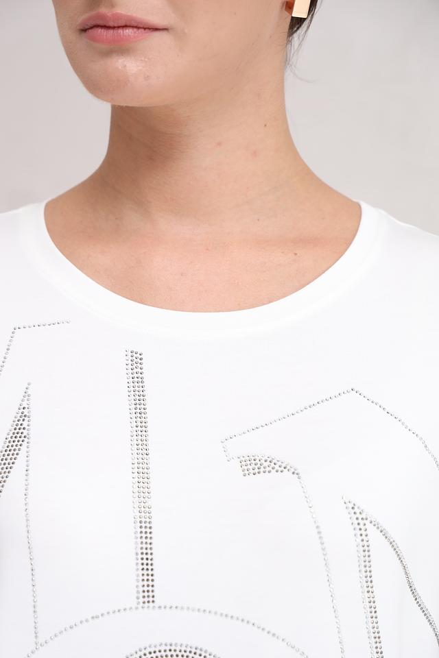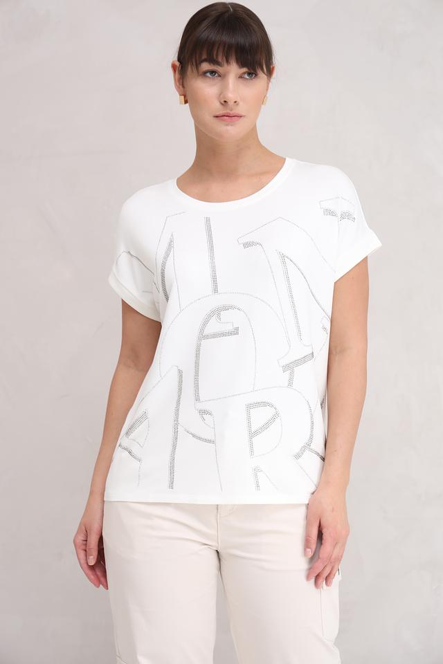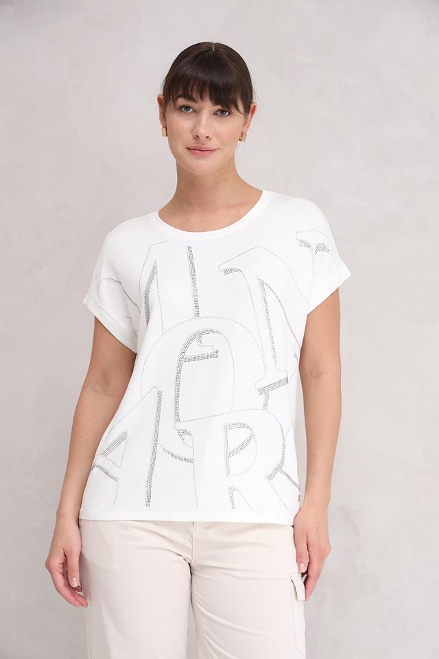 Белая футболка Monari с оригинальным графичным принтом. Изготовлена из мягкой и приятной к телу ткани на основе вискозы и модала, обеспечивающей комфорт в носке. Стильный и лаконичный дизайн. Состав: вискоза 45%, модал 45%, эластан 10%