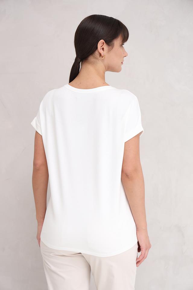 Модель имеет прямой крой, короткие рукава с небольшим подворотом и круглый вырез горловины. Футболка выполнена из высококачественного трикотажа, состоящего из 45% вискозы, 45% модала и 10% эластана. Такое сочетание материалов обеспечивает мягкость, комфорт и хорошую посадку по фигуре.
