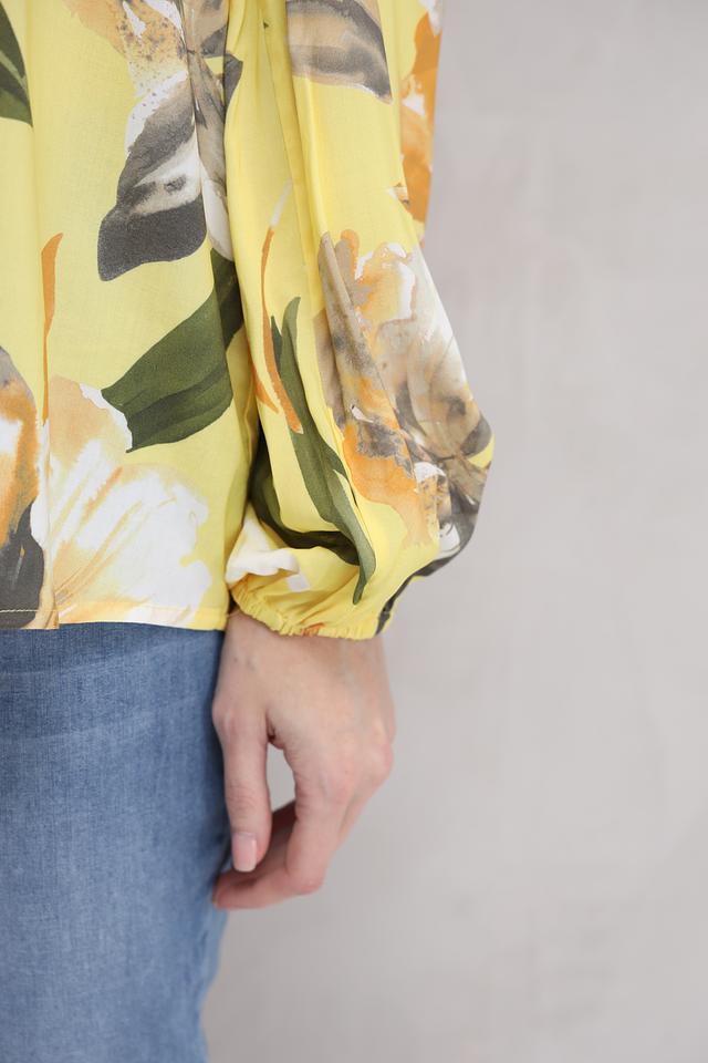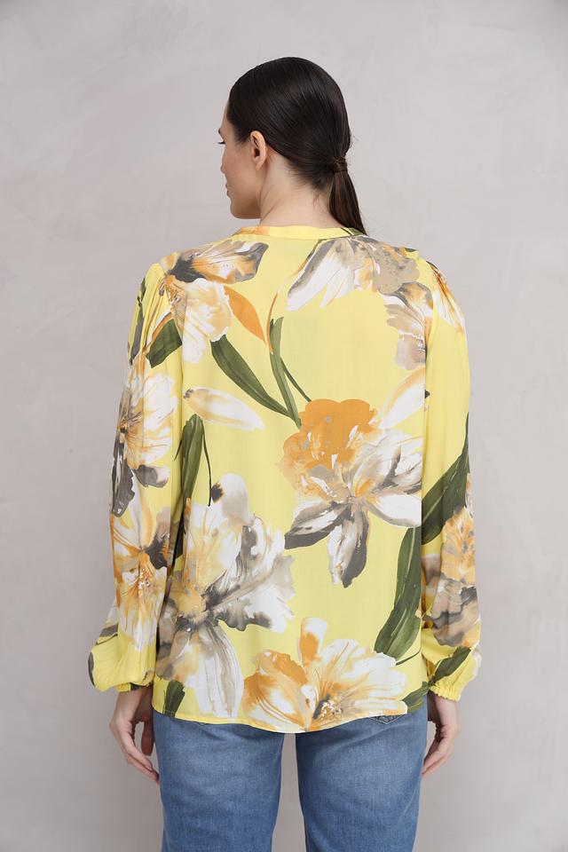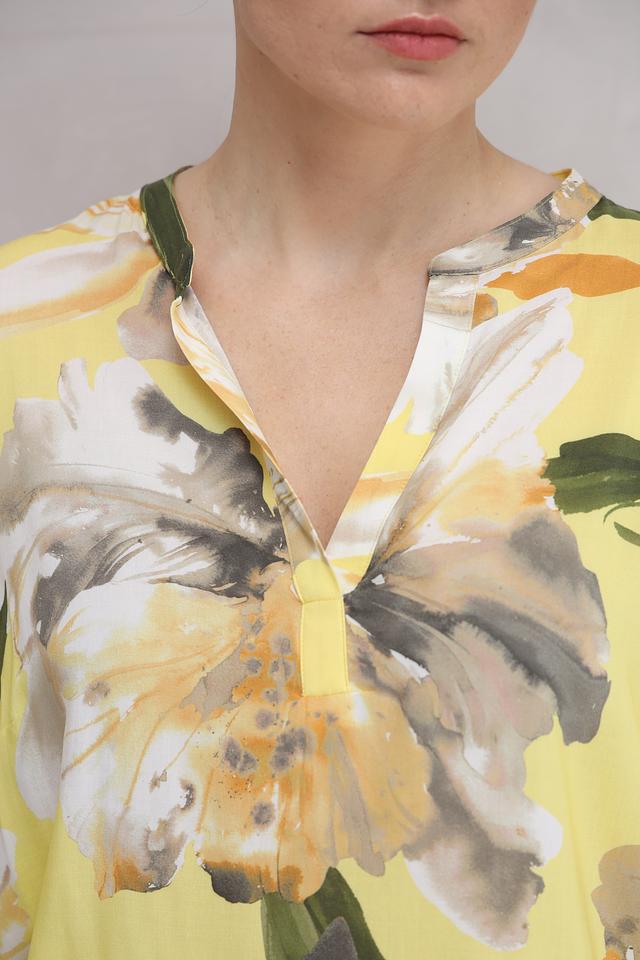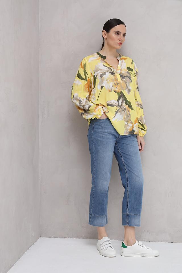 Особенностью данной модели является её оригинальный цветочный принт, сочетающий в себе оттенки жёлтого, оранжевого, белого и зелёного. V-образный вырез горловины и застёжка на пуговицы добавляют блузе элегантности.