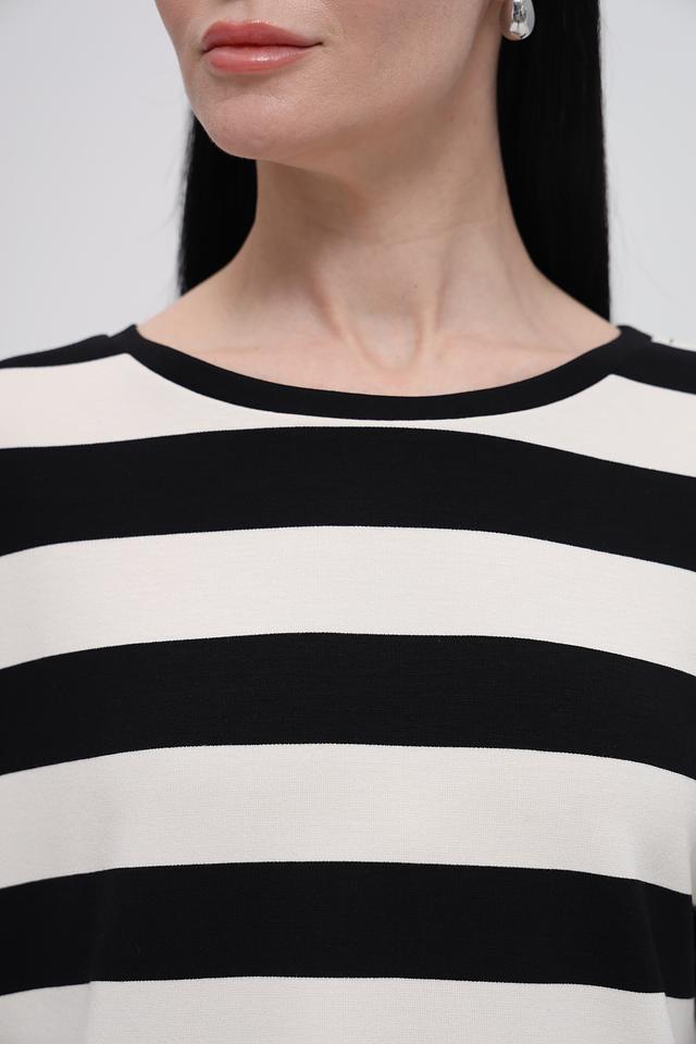 Женская футболка Monari чёрно-белого цвета с классическим полосатым принтом. Изготовлена из мягкой вискозы с добавлением полиэстера и эластана для комфорта и хорошей посадки. Состав: вискоза 80%, полиэстер 15%, эластан 5%