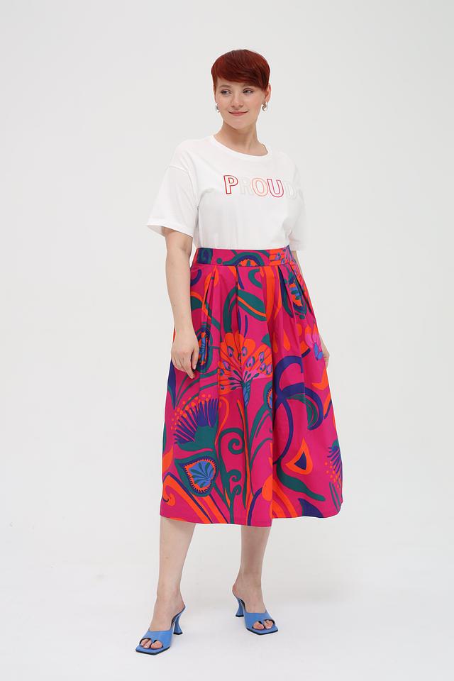 Особенностью данной модели является яркая надпись "PROUD", выполненная в нескольких цветах: розовом, оранжевом, желтом и голубом. Эта деталь придает футболке индивидуальность и выразительность. Крой футболки свободный, что обеспечивает свободу движений и комфортную посадку по фигуре.