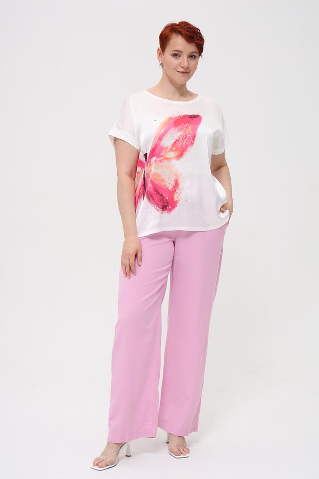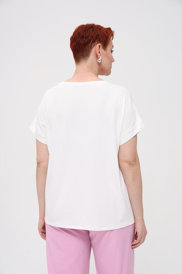 Футболка изготовлена из 100% полиэстера, что обеспечивает легкость и простоту в уходе. Она идеально сочетается с джинсами, брюками или юбками, позволяя создавать разнообразные образы.