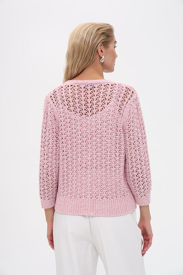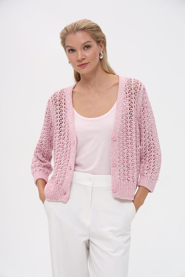 Этот жакет от Monari выполнен в нежном розовом цвете и отличается ажурным дизайном. Модель имеет V-образный вырез и застёжку на пуговицы, что позволяет создавать различные варианты стилизации.