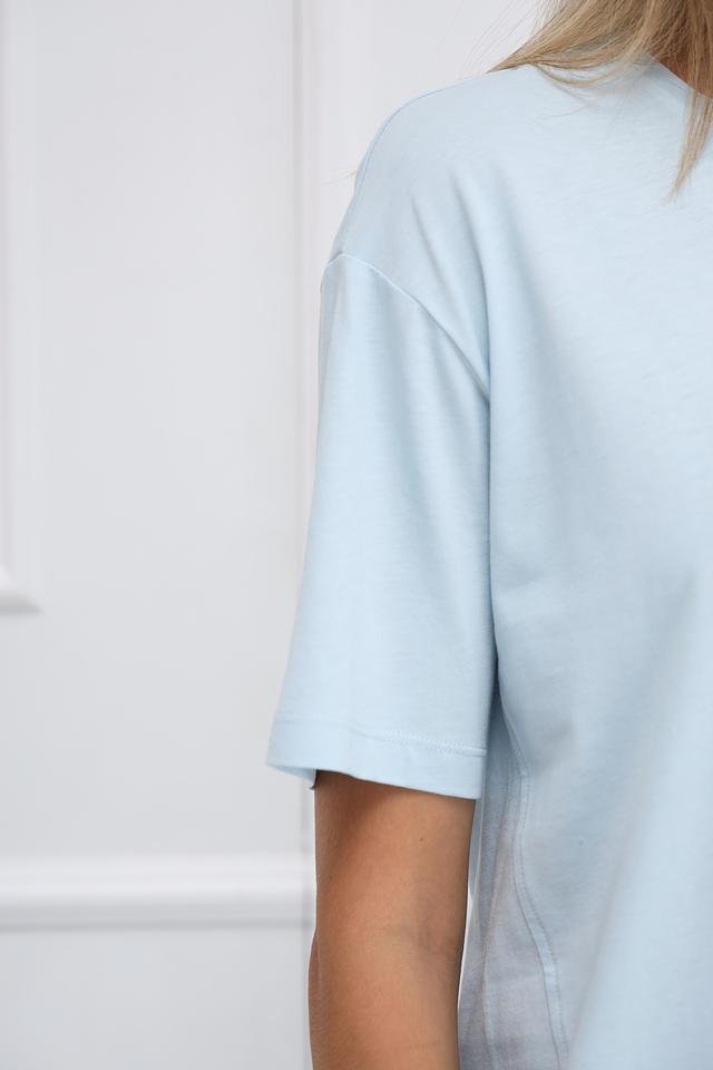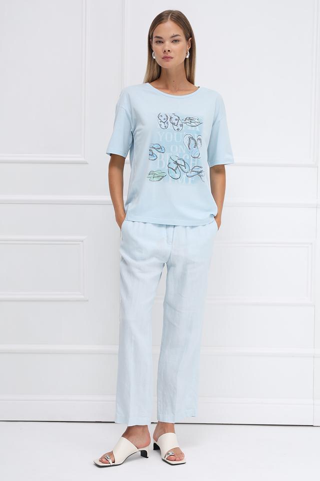 Голубая футболка Monari с оригинальным принтом в виде губ станет стильным дополнением к вашему образу. Модель свободного кроя выполнена из мягкого хлопка с модалом, обеспечивающего комфорт в носке. Состав: хлопок 50%, модал 50%