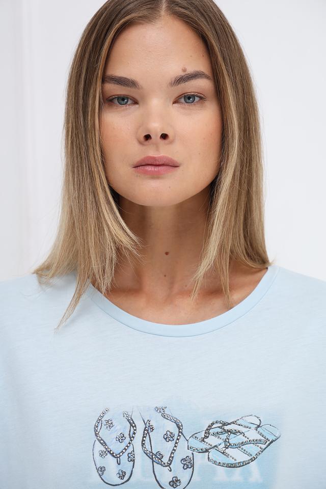 Эта футболка от Monari – идеальный выбор для создания непринужденного и модного образа. Футболка выполнена в нежном голубом цвете и украшена ярким принтом с изображением губ.