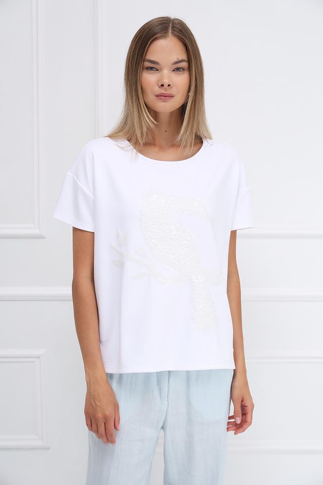 Особенностью данной модели является оригинальный принт в виде птицы, выполненный в белых и светло-серых тонах. Футболка имеет прямой крой, короткие рукава с небольшим подворотом и круглый вырез горловины.