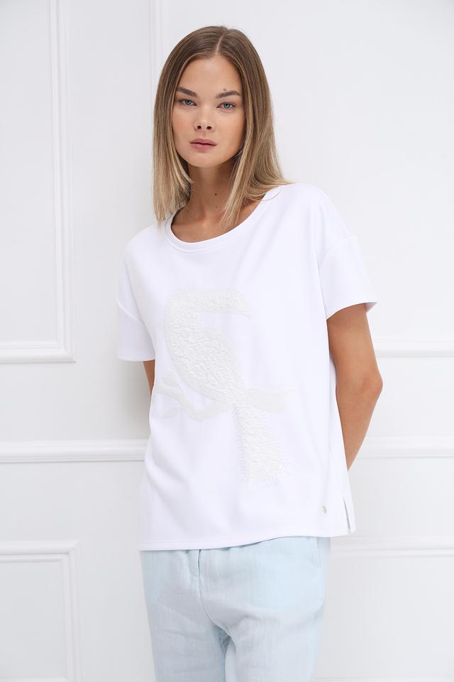 Белая футболка Monari с оригинальным принтом — стильное и комфортное решение для повседневного образа. Изготовлена из мягкого сочетания полиэстера, вискозы и эластана, обеспечивающего удобную посадку и приятные ощущения на коже. Состав: полиэстер 55%, вискоза 38%, эластан 7%