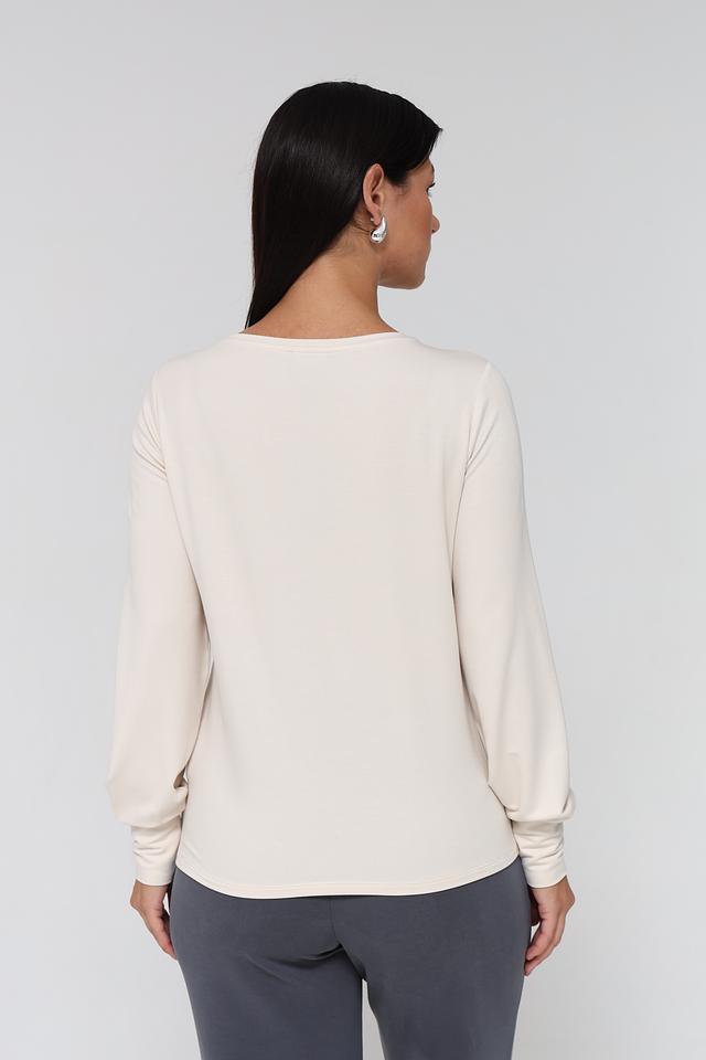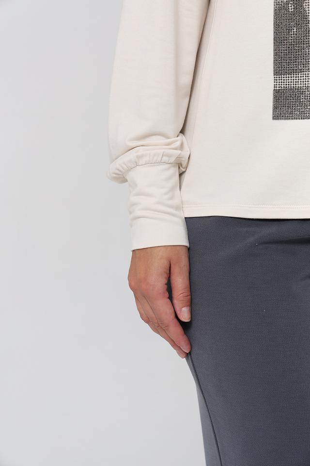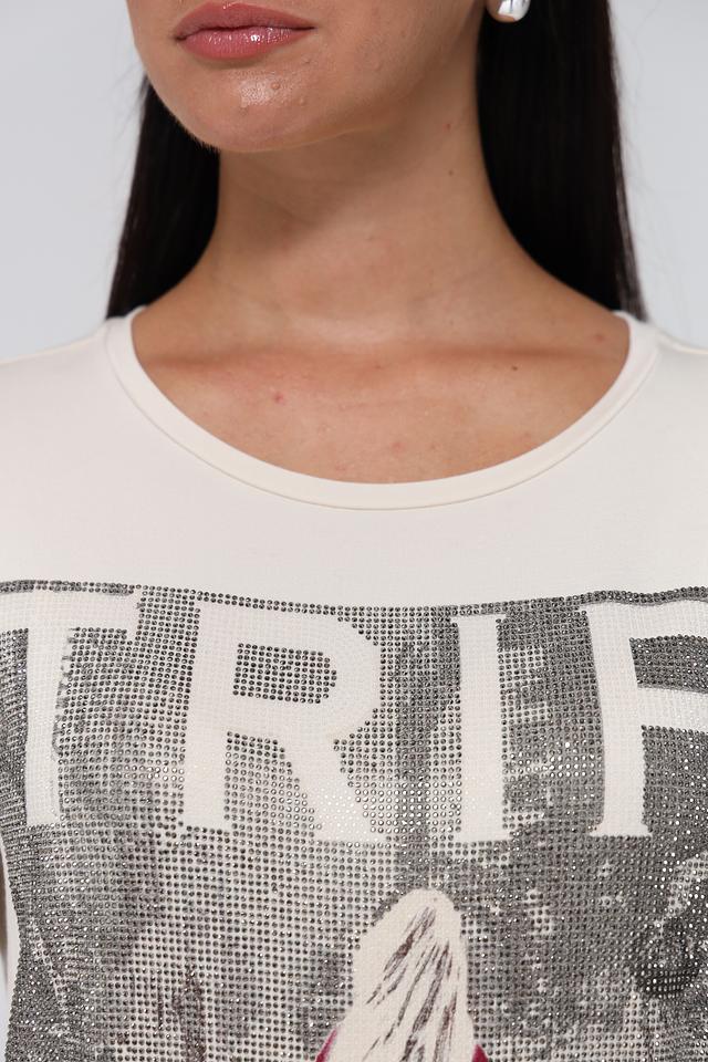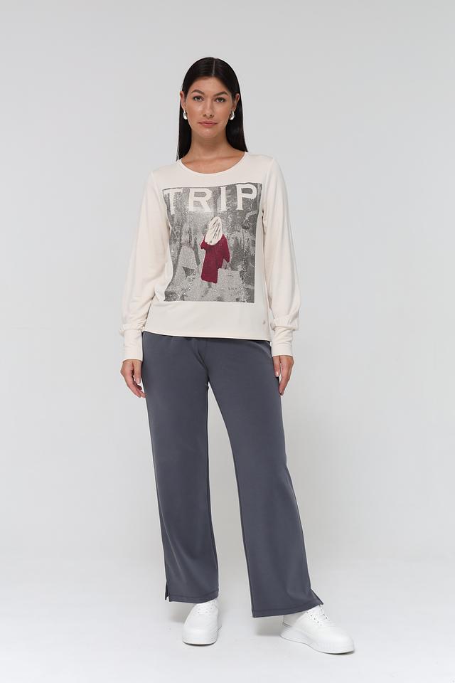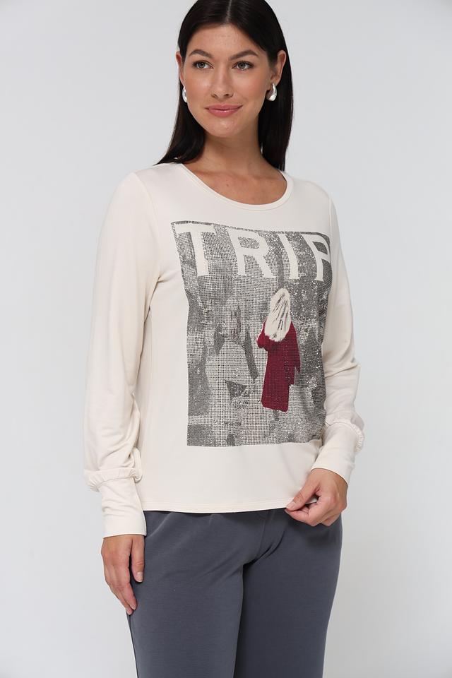 Лонгслив Monari кремового цвета с эффектным принтом "TRIP", выполненным из блестящих элементов. Модель имеет удобный крой и рукава с манжетами, идеально подходит для создания стильного повседневного образа. Состав: вискоза 45%, модал 45%, эластан 10%