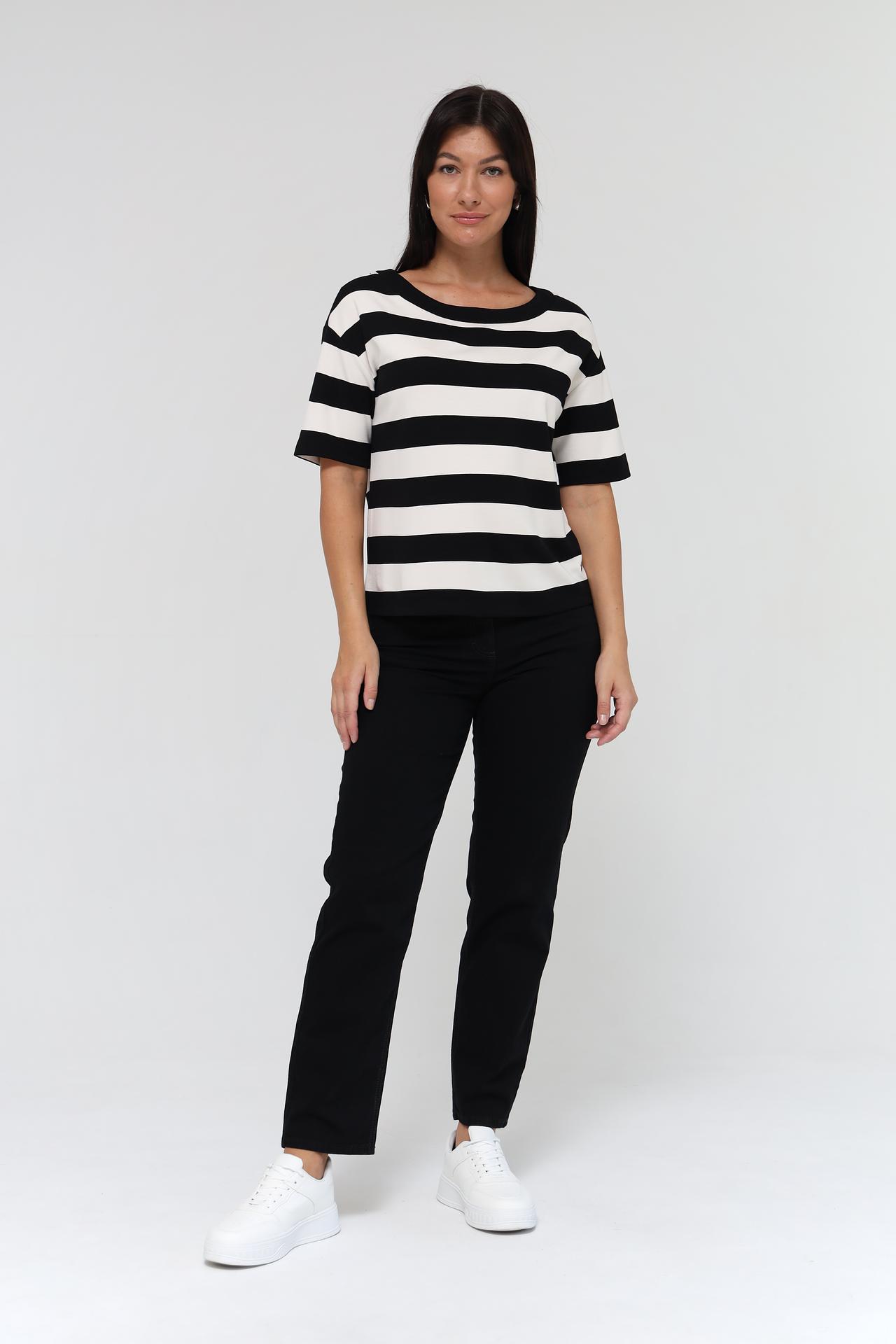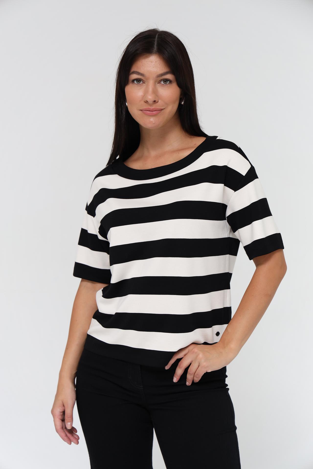 Классическая женская футболка Monari с эффектным принтом в чёрно-белую полоску – универсальная базовая модель для повседневного гардероба. Эта футболка легко комбинируется с различными стилями, идеально подходит для создания стильных и комфортных образов, будь то casual выход или встреча с друзьями.