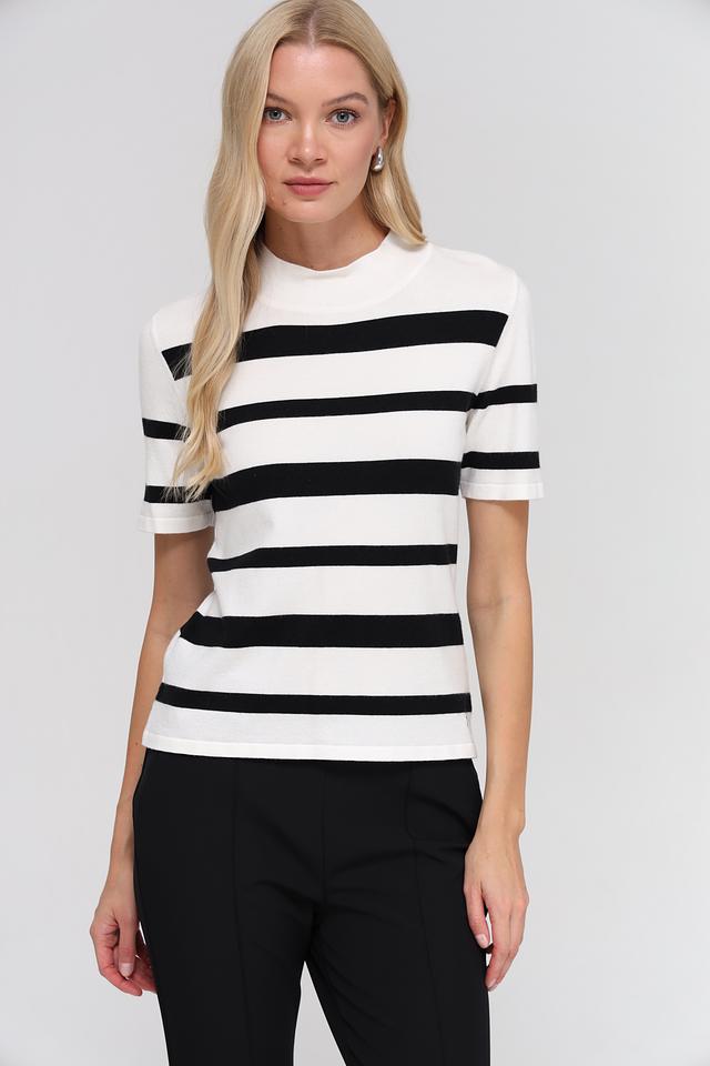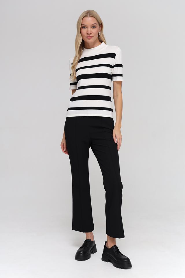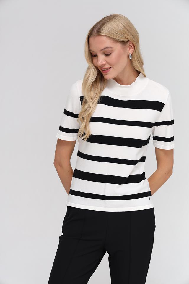 Женский пуловер Monari чёрно-белого цвета с коротким рукавом и круглым вырезом. Изготовлен из мягкой вискозы, полиэстера и полиамида, обеспечивающих комфорт и удобство в носке. Состав: вискоза 50%, полиэстер 28%, полиамид 22%