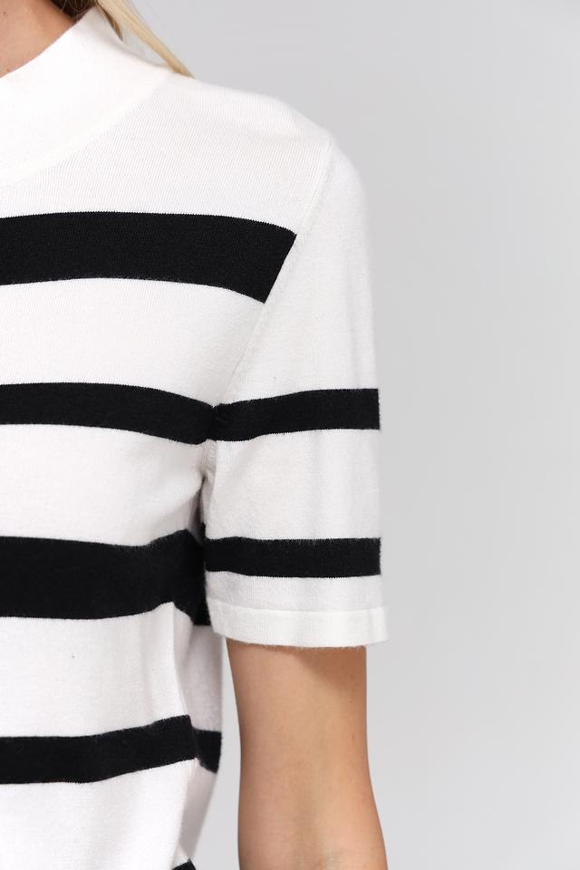 Этот стильный пуловер от Monari станет отличным дополнением к вашему гардеробу. Классическое сочетание чёрного и белого цветов в виде горизонтальных полос делает его универсальным и подходящим для различных образов.