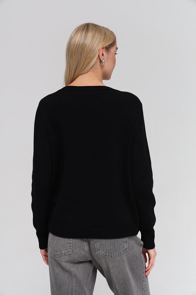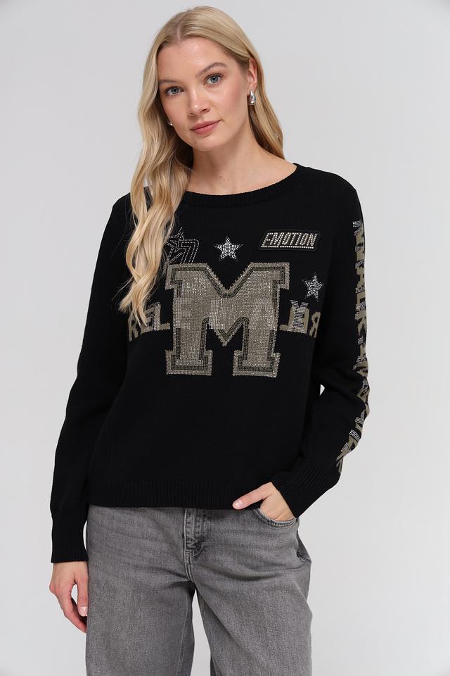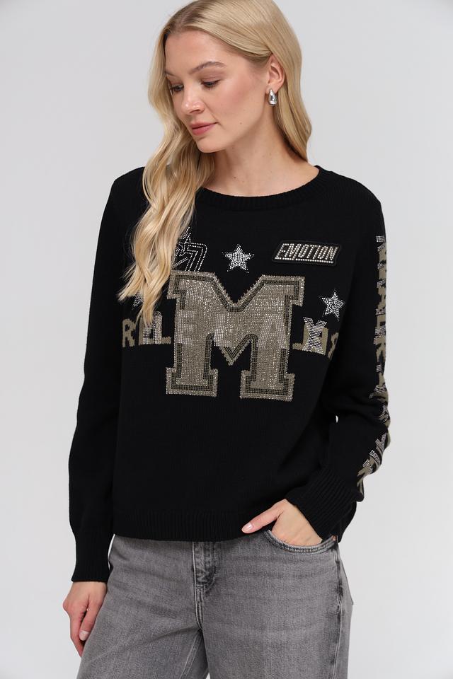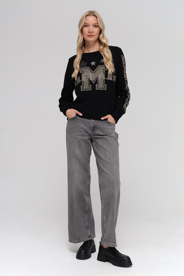 Чёрный пуловер Monari, украшенный крупной буквой "M" с блестками и декоративными элементами. Изготовлен из хлопка с добавлением полиакрила для мягкости и комфорта. Состав: хлопок 60%, полиакрил 40%
