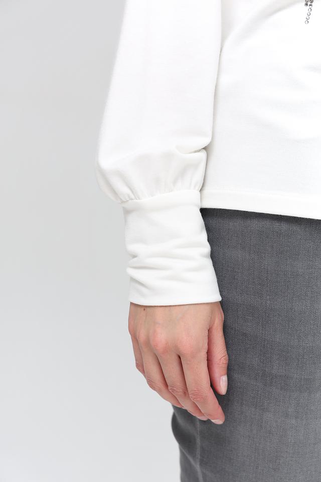 Эта блуза от Monari выполнена в белом цвете и украшена эффектным принтом с изображением сумки и надписью "STYLE". Принт выполнен в чёрно-серебристой гамме, что придает блузе изысканность.