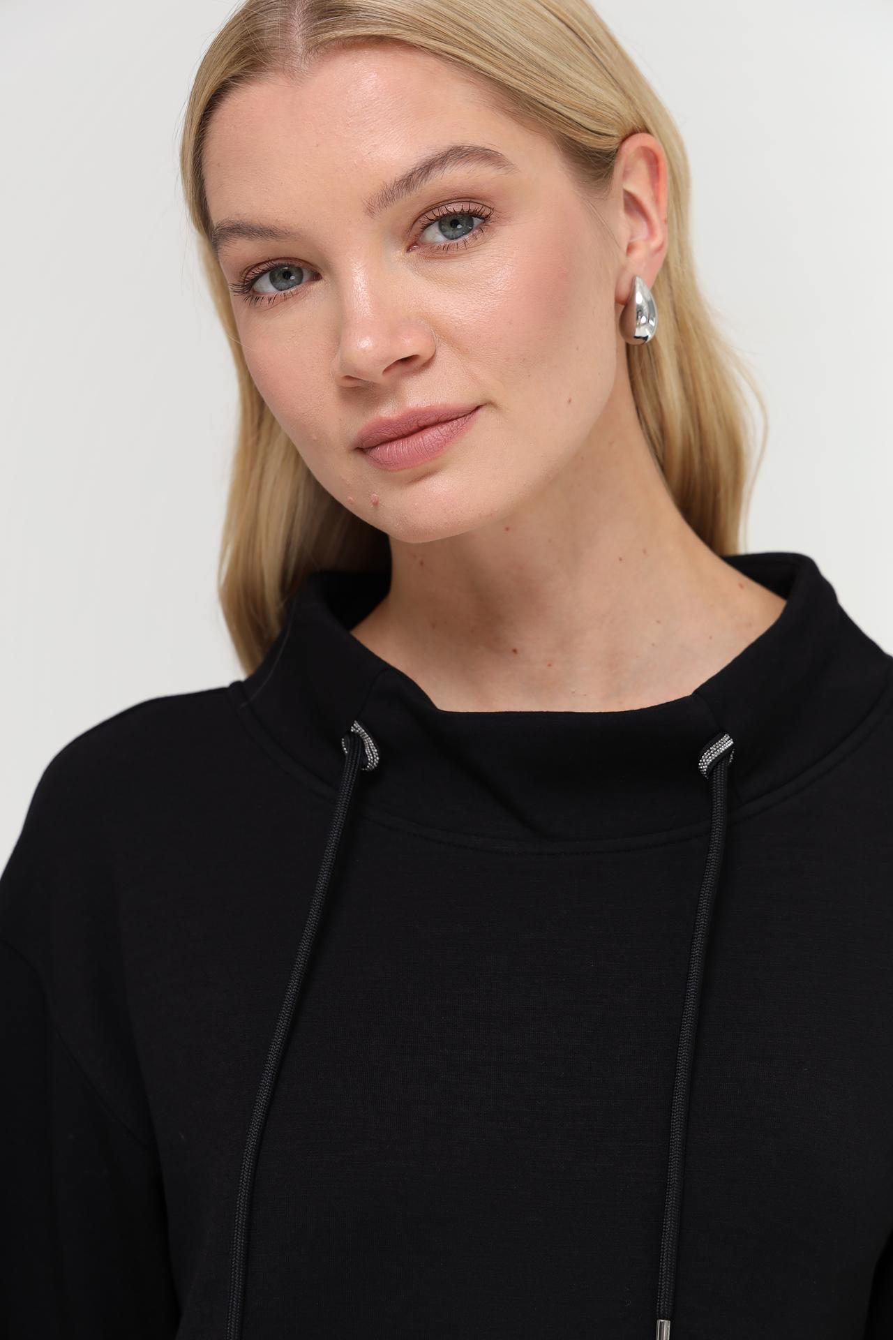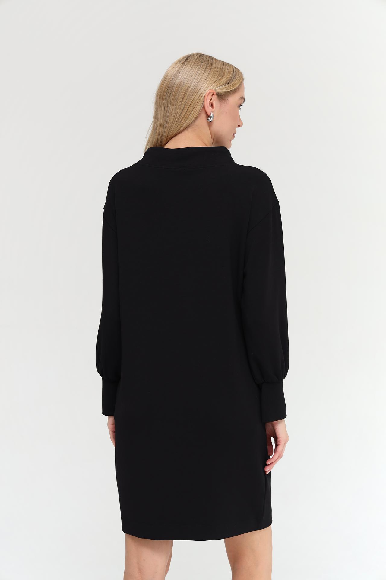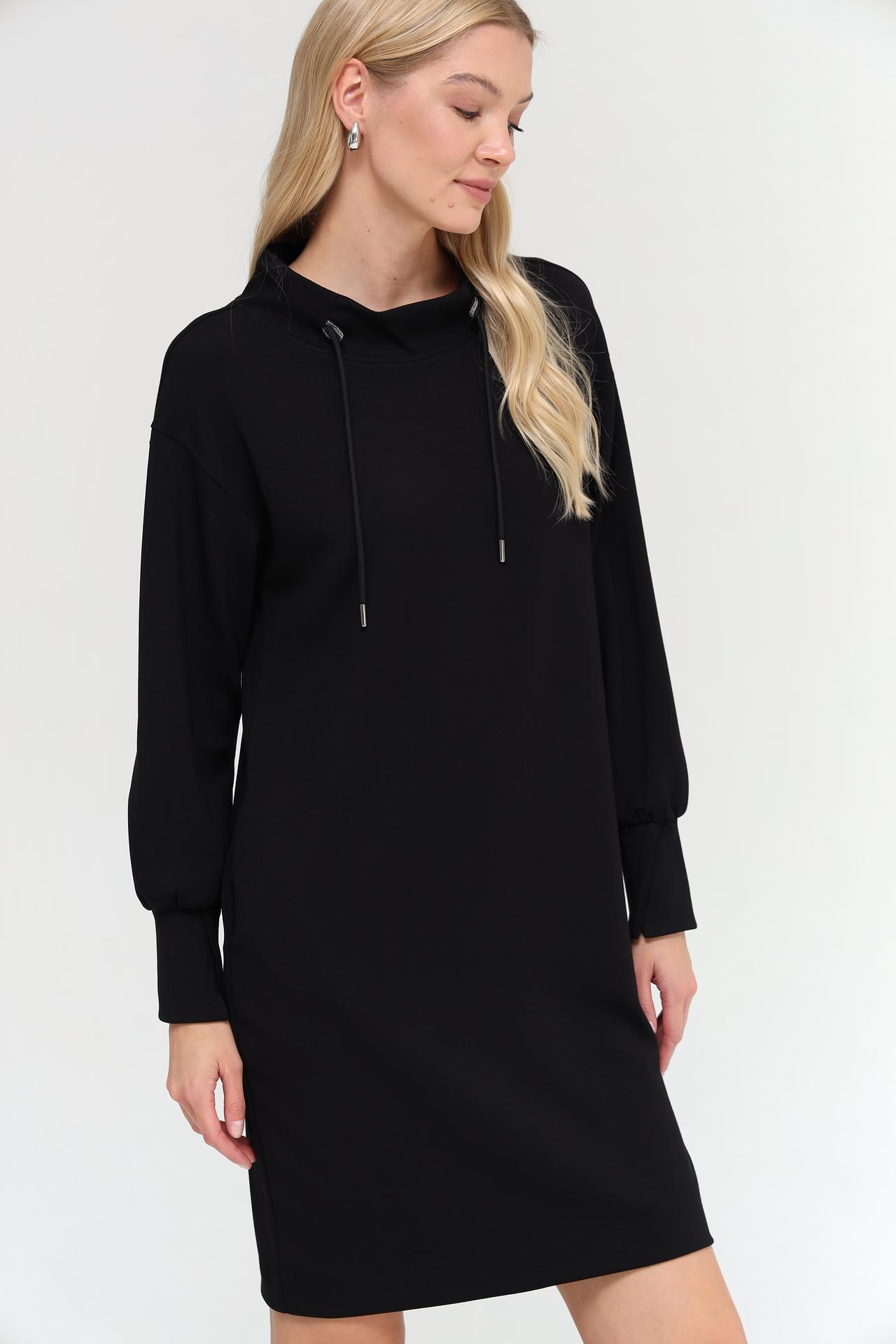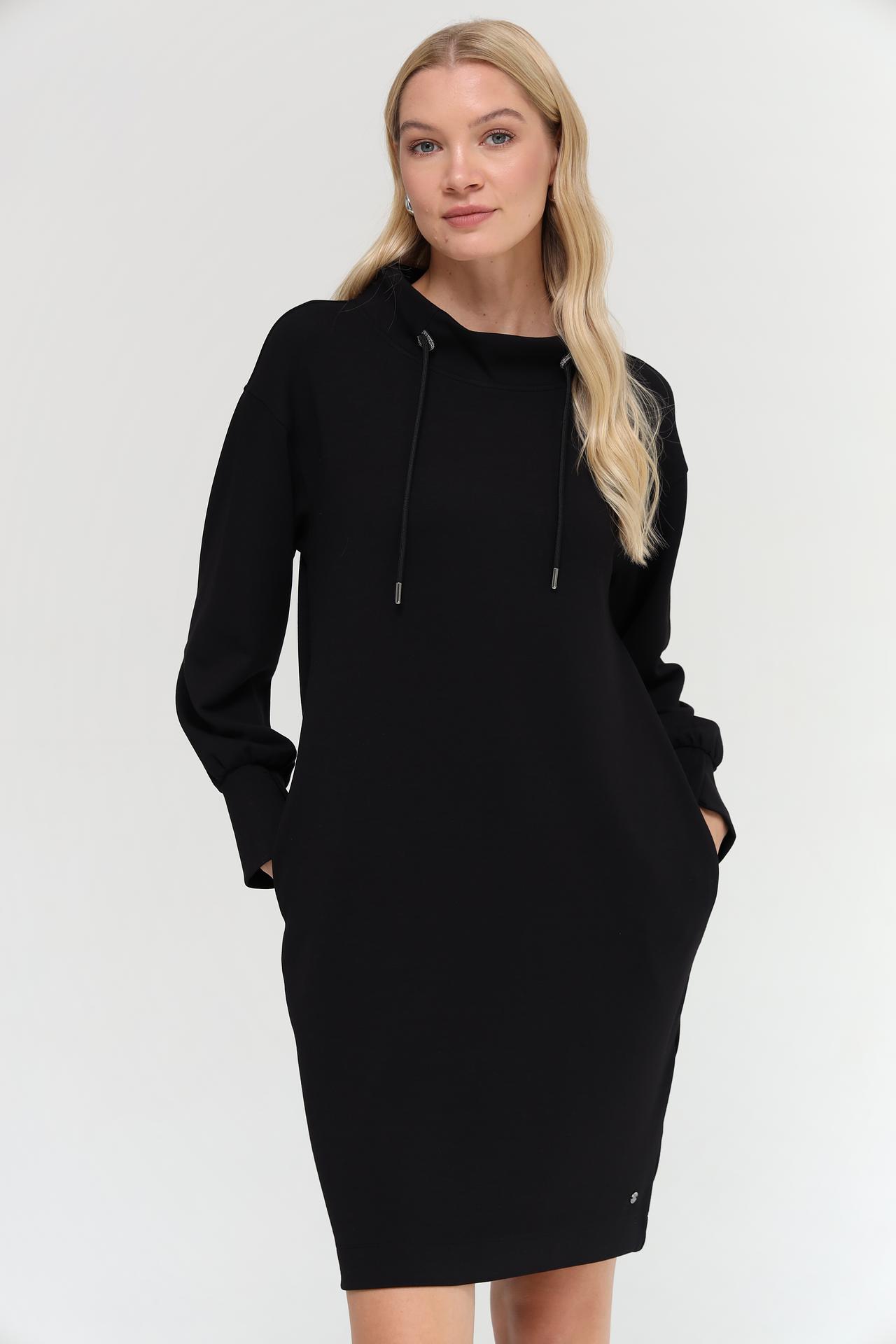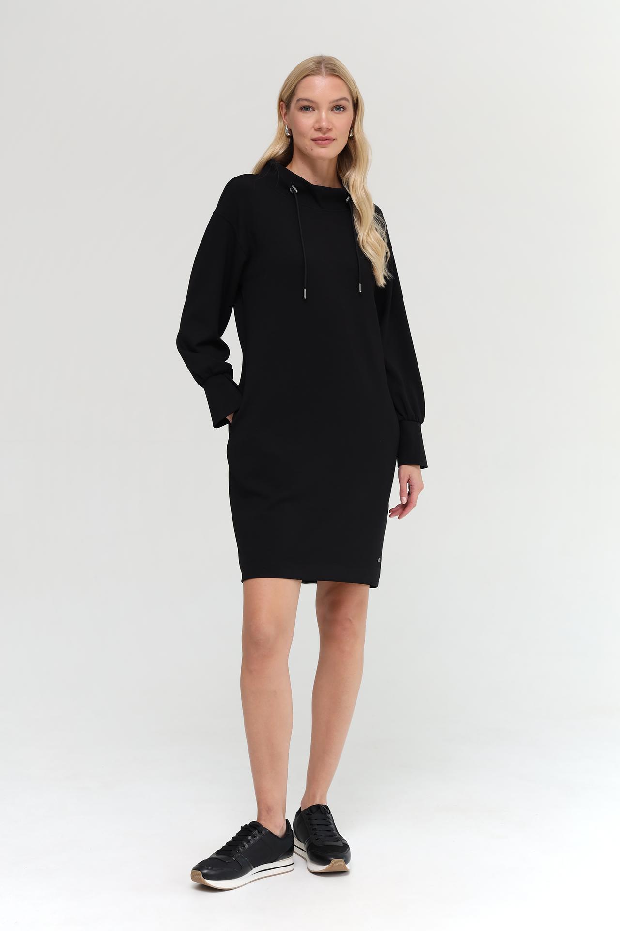 Представляем элегантное черное платье Monari, идеально подходящее для создания стильных повседневных образов. Модель выполнена из смесовой ткани с добавлением модала, полиэстера и эластана, что обеспечивает комфорт и отличную посадку по фигуре. Высокий воротник с регулируемым шнурком добавляет образу особую изюминку, а объемные рукава с манжетами придают современный вид. Это платье сочетает в себе практичность и модный дизайн, делая его незаменимым элементом вашего гардероба.