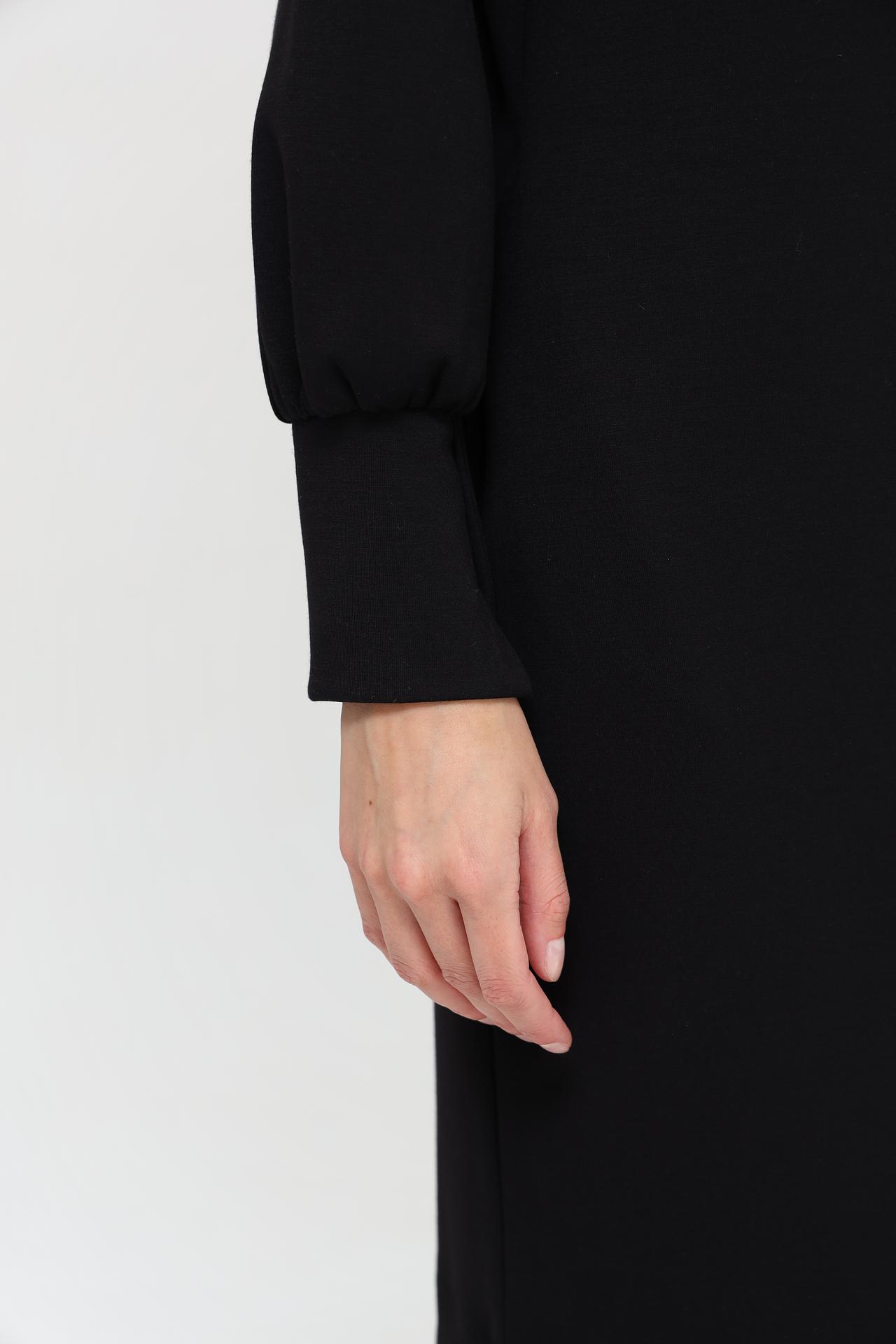 - Дизайн: Прямой силуэт платья выгодно подчеркивает фигуру, а высокий воротник-стойка с кулиской позволяет регулировать посадку и создавать разные образы. Длинные рукава с акцентными манжетами добавляют элегантности.