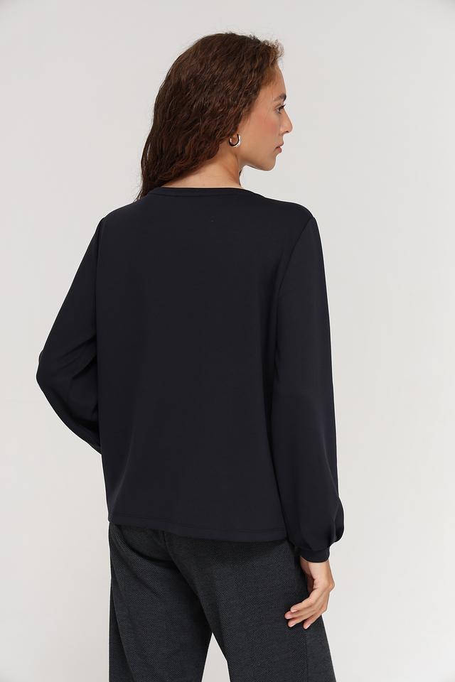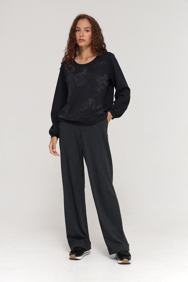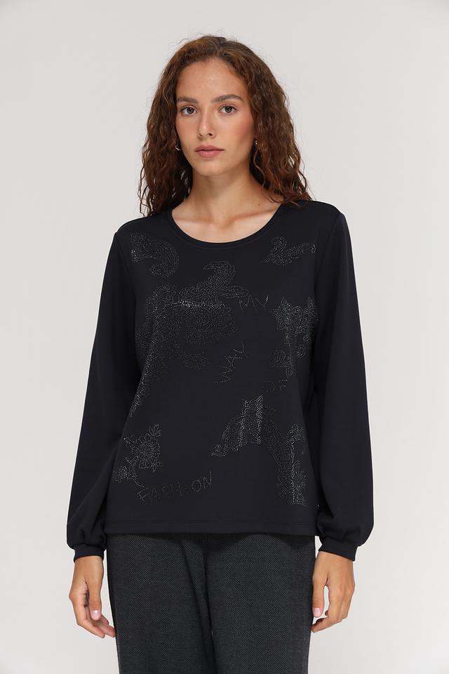 Чёрный пуловер Monari с оригинальным декором из страз. Изготовлен из мягкого сочетания полиэстера, вискозы и эластана, обеспечивающего комфорт и удобство в носке. Состав: полиэстер 55%, вискоза 38%, эластан 7%