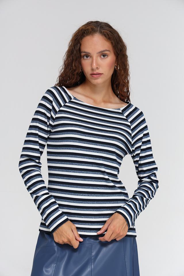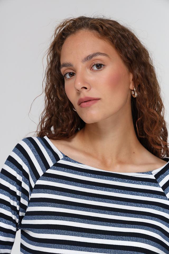 Лонгслив выполнен в классической полосатой расцветке, сочетающей в себе оттенки синего и белого. Круглый вырез горловины и длинные рукава делают его универсальным для различных образов. Приталенный силуэт подчеркивает фигуру, а эластан в составе обеспечивает отличную посадку и свободу движений.