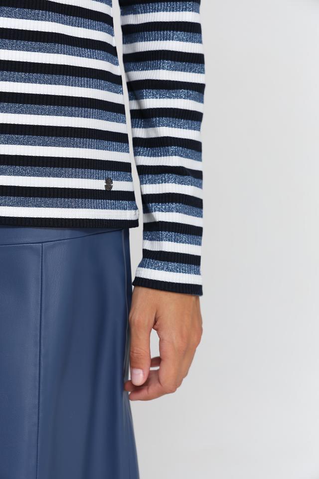 Женский лонгслив Monari синего и белого цвета с полосатым принтом. Изготовлен из мягкого и приятного к телу сочетания полиэстера и вискозы, обеспечивающего комфорт в носке. Отличный выбор для создания стильного повседневного образа. Состав: полиэстер 62%, вискоза 30%, эластан 4%, метализ.полиэстер 4%