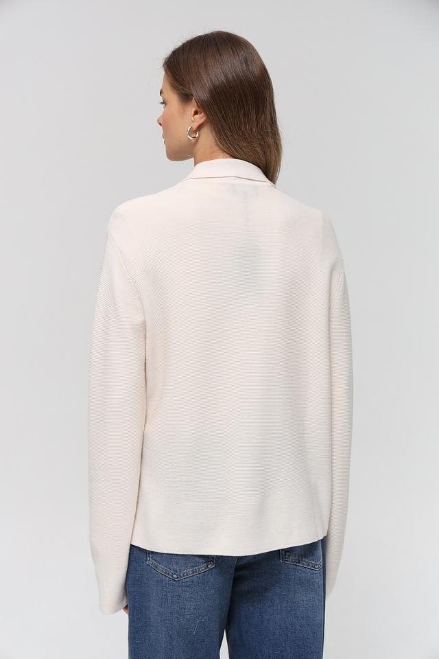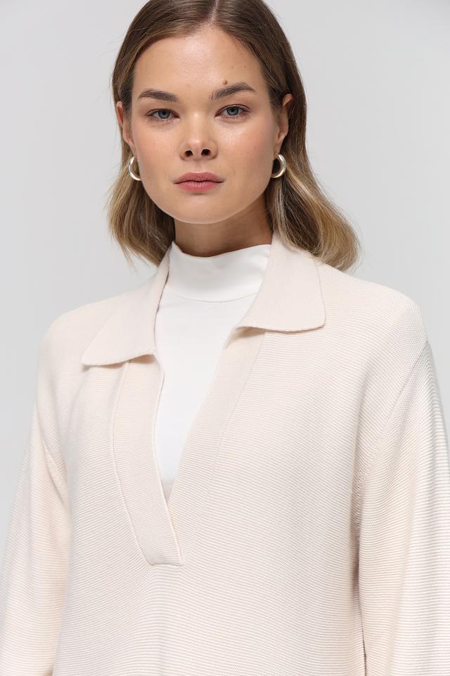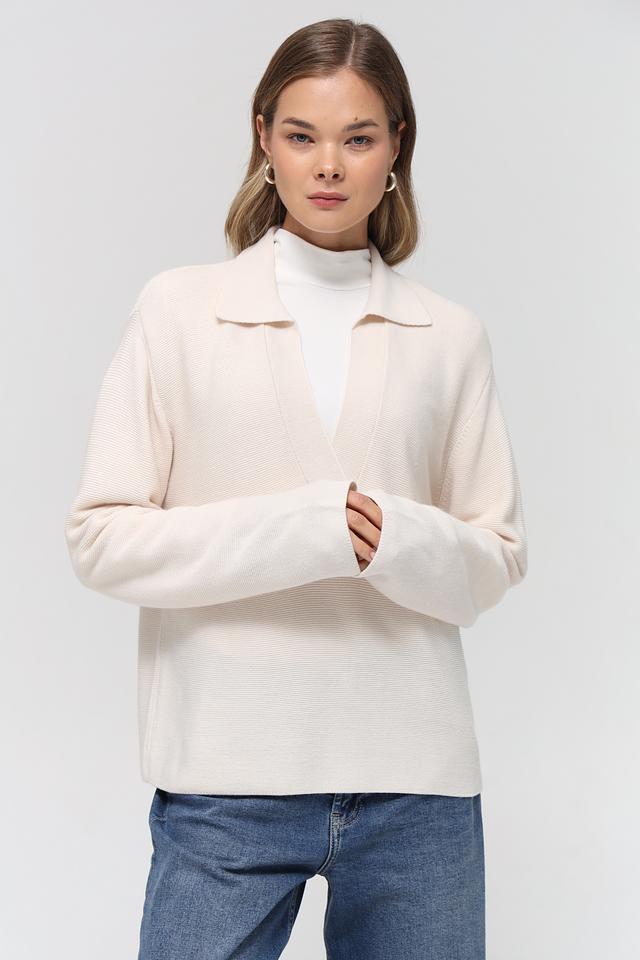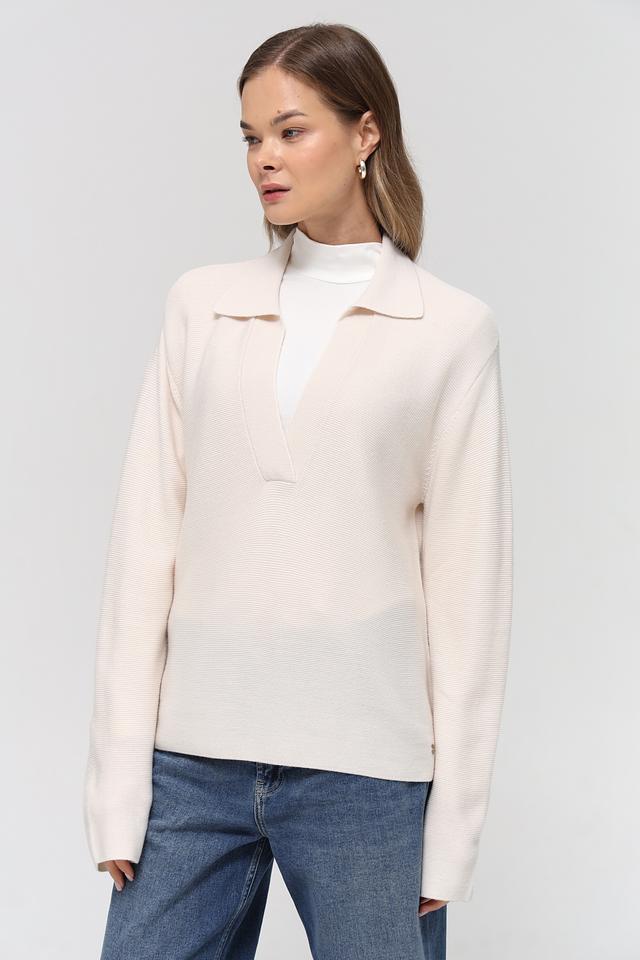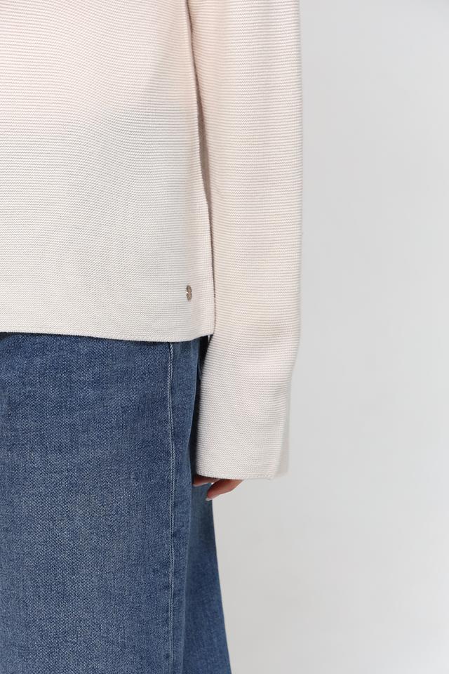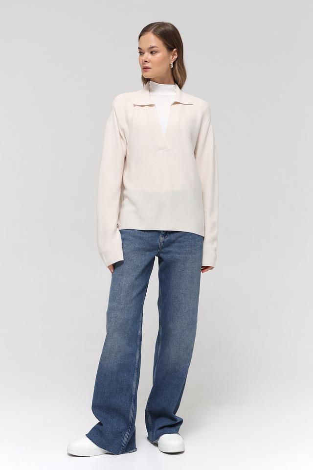 Модель имеет прямой крой и воротник-стойку, который добавляет изысканности. Пуловер с длинными рукавами идеально подходит для прохладной погоды.