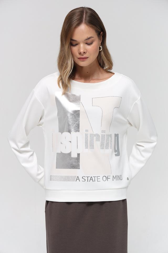 Этот стильный пуловер от Monari выполнен в белом цвете и украшен эффектным принтом с надписью "Inspiring A State of Mind". Модель имеет свободный крой, который обеспечивает комфорт и свободу движений.