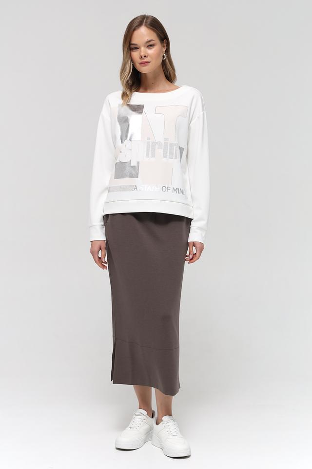 Белый пуловер Monari с оригинальным принтом и надписью "A State of Mind" станет стильным дополнением к вашему гардеробу. Модель свободного кроя выполнена из мягкого и приятного к телу материала. Состав: полиэстер 55%, вискоза 38%, эластан 7%
