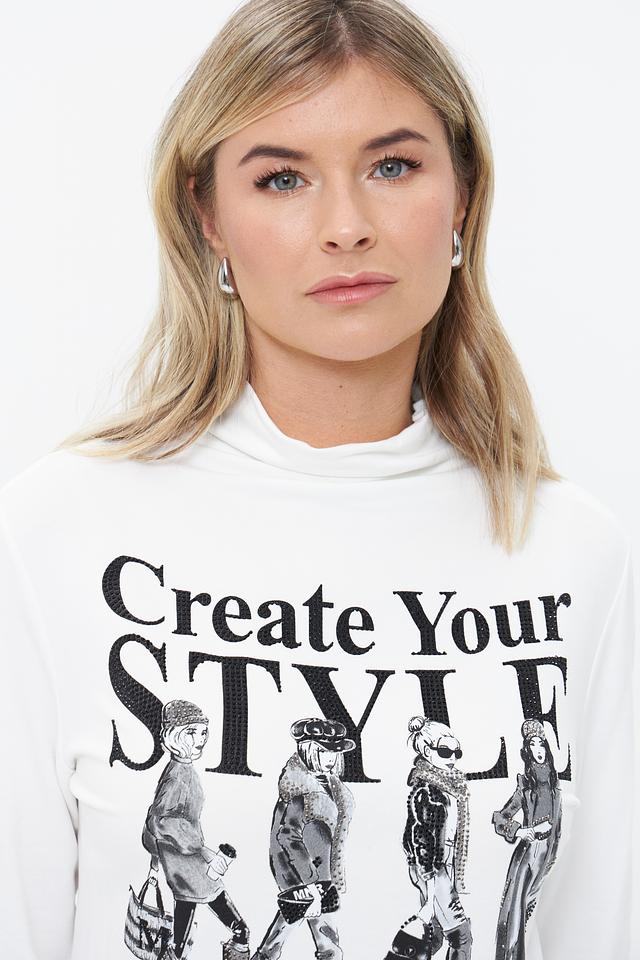 Основным акцентом является эффектный принт "Create Your Style" с изображением силуэтов моделей в чёрно-белой гамме. Принт добавляет образу оригинальности и индивидуальности.